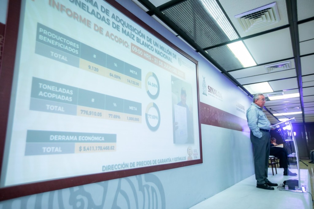 Mientras que, por parte de Segalmex el Ejecutivo Estatal comentó que se han atendido a 9,120 productoras y productores de maíz y se han acopiado 776 mil 910.05 toneladas, lo que equivale a un 77.69% y a una derrama económica de $5,411,178,468.62.