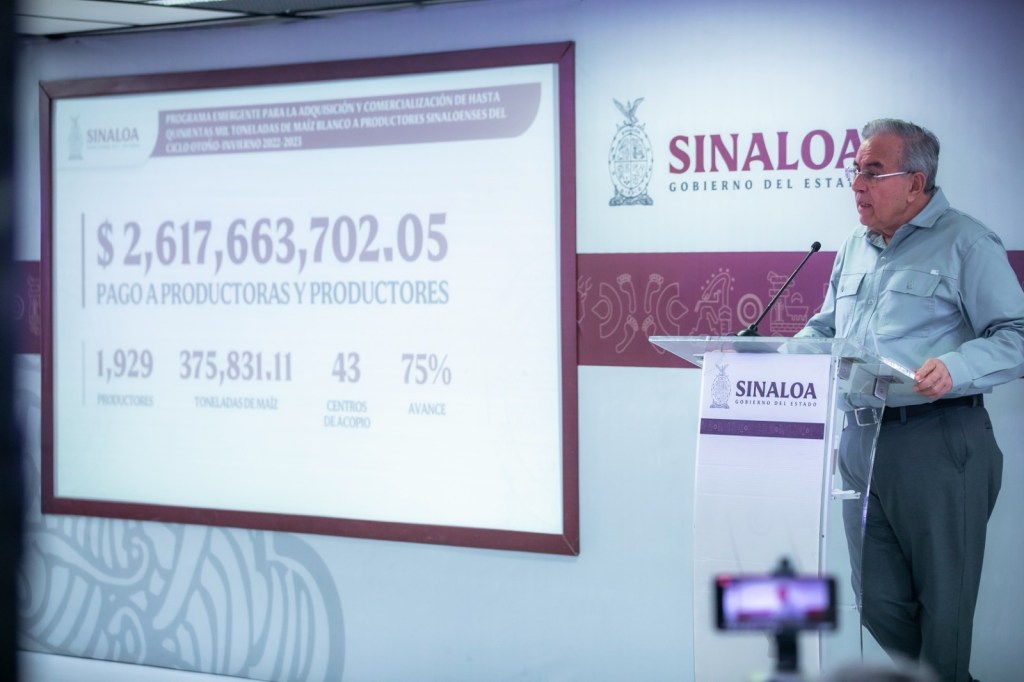 Culiacán, Sinaloa, julio del 2023.- El gobernador Rubén Rocha Moya, informó en su Conferencia Semanera que el programa de la compra de maíz por parte del Gobierno del Estado y Segalmex ya ha pagado a un 75% del total de productoras y productores del grano por parte del gobierno del Estado y un 64.58% por parte de Segalmex, lo que equivale a más de 11 mil productoras y productores atendidos de los 19 mil que son parte del programa.