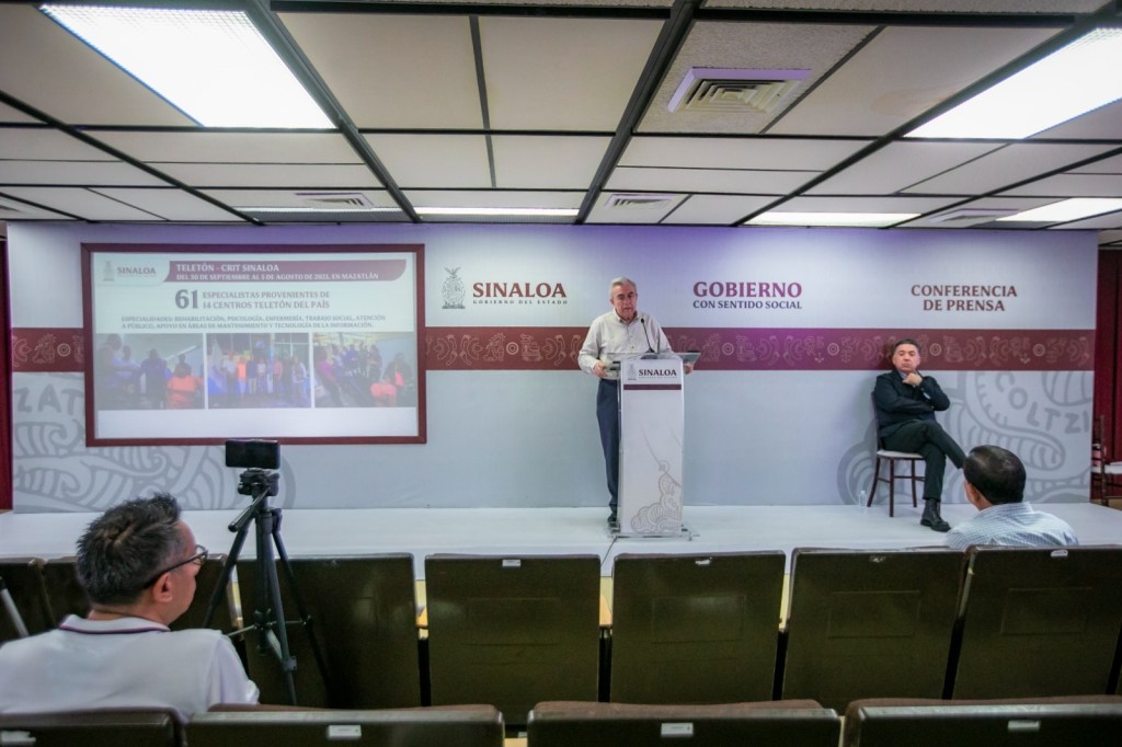 Culiacán, Sinaloa, a agosto de 2023.- Durante su Conferencia Semanera, el gobernador Rubén Rocha Moya dio a conocer que la fecha de inauguración del CRIT Teletón de Mazatlán será el 3 de noviembre, y los 558 niños y niñas que están registrados para recibir sus tratamientos de rehabilitación ya fueron evaluados por personal médico y especialistas de la Fundación Teletón la semana pasada en un jornada que congregó en Mazatlán a 61 especialistas provenientes de 14 Centros Teletón de todo el país.