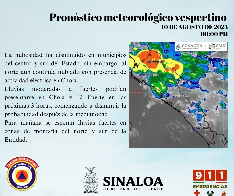 Mencionó que, para esta noche de jueves, el pronóstico indica que se tendrán lluvias concretas en la zona norte del estado, siendo El Fuerte, Choix y Sinaloa, los municipios en donde principalmente se concentrarán las precipitaciones, mientras que para Culiacán continuarán las lluvias ligeras y moderadas.