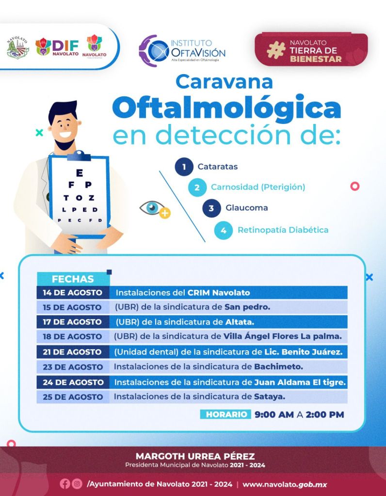 Navolato, Sinaloa, a agosto de 2023*.- El Ayuntamiento de Navolato que preside la Alcaldesa Margoth Urrea Pérez, a través del Sistema DIF Municipal en coordinación con el Instituto Oftavisión, realizarán una caravana oftalmológica gratuita en todo el municipio, con la finalidad de que las y los navolatenses sean atendidos y puedan detectar de manera oportuna problemas de carnosidad, cataratas, glaucoma y retinopatía diabética.