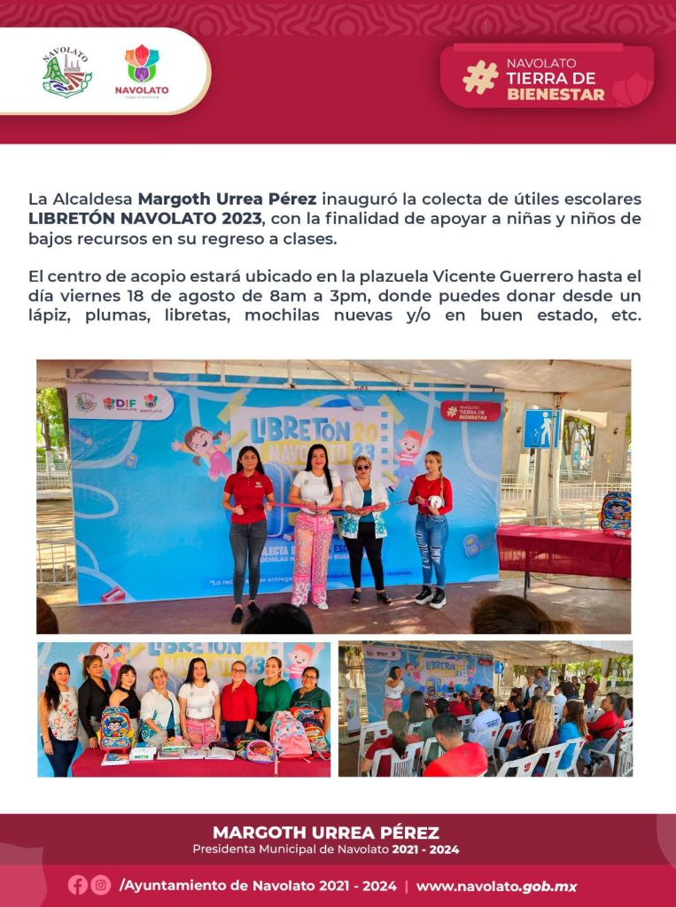 “Hoy inauguramos la colecta de útiles escolares LIBRETÓN NAVOLATO 2023, con la finalidad de apoyar a niñas y niños de bajos recursos en su regreso a clases. Las y los invito a hacer feliz a un estudiante, vamos juntos a apoyar a los niños de Navolato. Podemos apoyar desde un lápiz, un sacapuntas, una libreta. El centro de acopio estará ubicado en la plazuela Vicente Guerrero de 8 de la mañana a 3 de la tarde hasta el día viernes 18 de agosto. Juntas y juntos transformemos a Navolato en una Tierra de Bienestar” Margoth Urrea.