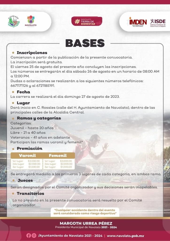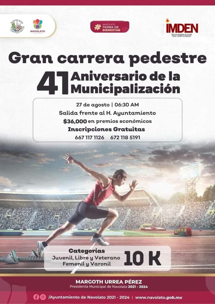 Navolato, Sinaloa, a agosto de 2023*.- El H. Ayuntamiento de Navolato que preside la Alcaldesa Margoth Urrea Pérez, a través del Instituto Municipal de Cultura Física y Deporte, te invitan a que te inscribas totalmente gratis a la “Gran Carrera Pedestre, 41 Aniversario de la Municipalización de Navolato”, categorías juvenil, libre y veterano (femenil y varonil 10K), que se llevará a cabo el domingo 27 de agosto a las 6:30am, y donde se entregarán $36,000 pesos en premios económicos.