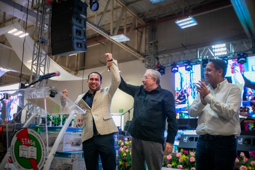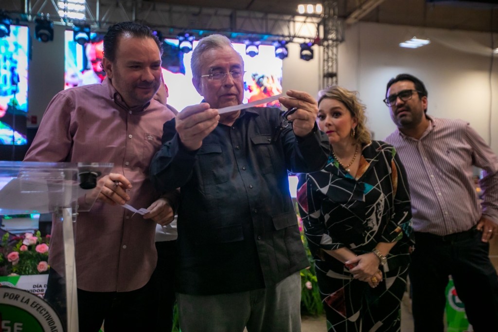 El mandatario estatal acudió al FigloStase acompañado por su hija, la presidenta del Sistema DIF Sinaloa, Eneyda Rocha Ruiz; por el secretario de Administración y Finanzas, Enrique Díaz Vega; y por el subsecretario de Administración, Juan Carlos Vizcarra Estrada, para saludar a los miles de trabajadores que acudieron al festejo anual que les organiza su sindicato, que incluye rifas de atractivos regalos, siendo el primer lugar una casa, y el segundo y tercer premio, automóviles último modelo, que fueron obtenidos de Gobierno del Estado como parte de las prestaciones del contrato colectivo de trabajo.