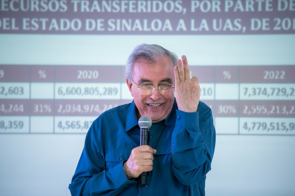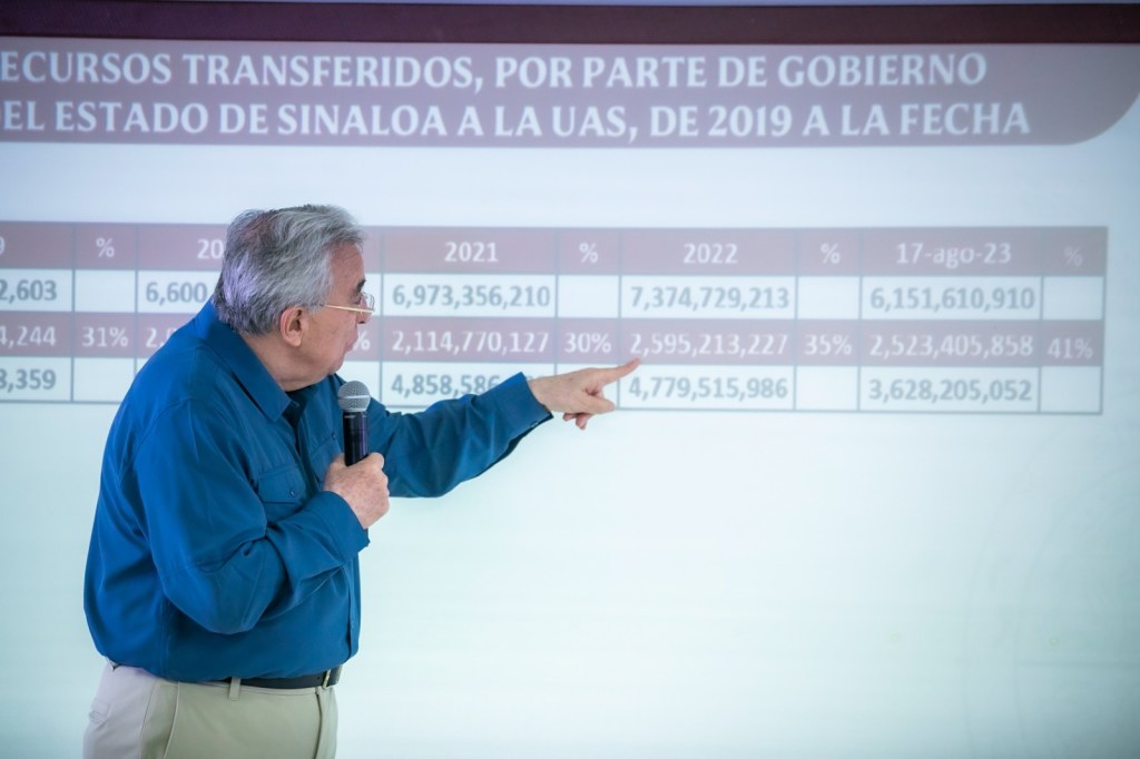 Tras señalar que desde el inicio de su administración se ha incrementado de manera exponencial el subsidio estatal para la universidad, Rocha Moya recordó que además, se está brindando un apoyo extraordinario de 120 millones de pesos mensuales para que la Universidad Autónoma de Sinaloa pueda pagar créditos fiscales contraídos ante el Servicio de Administración Tributaria.