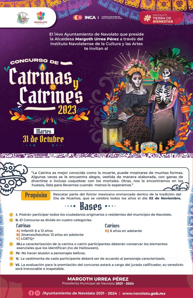 Navolato, Sinaloa, a octubre de 2023*.- Con el propósito de rescatar parte del folclor mexicano enmarcado dentro de la tradición del Día de Muertos, el 14vo Ayuntamiento que preside la alcaldesa Margoth Urrea Pérez a través del Instituto Navolatense de la Cultura y las Artes, te invitan a participar en el Concurso de Catrinas y Catrines 2023 a realizarse el próximo 31 de octubre.
