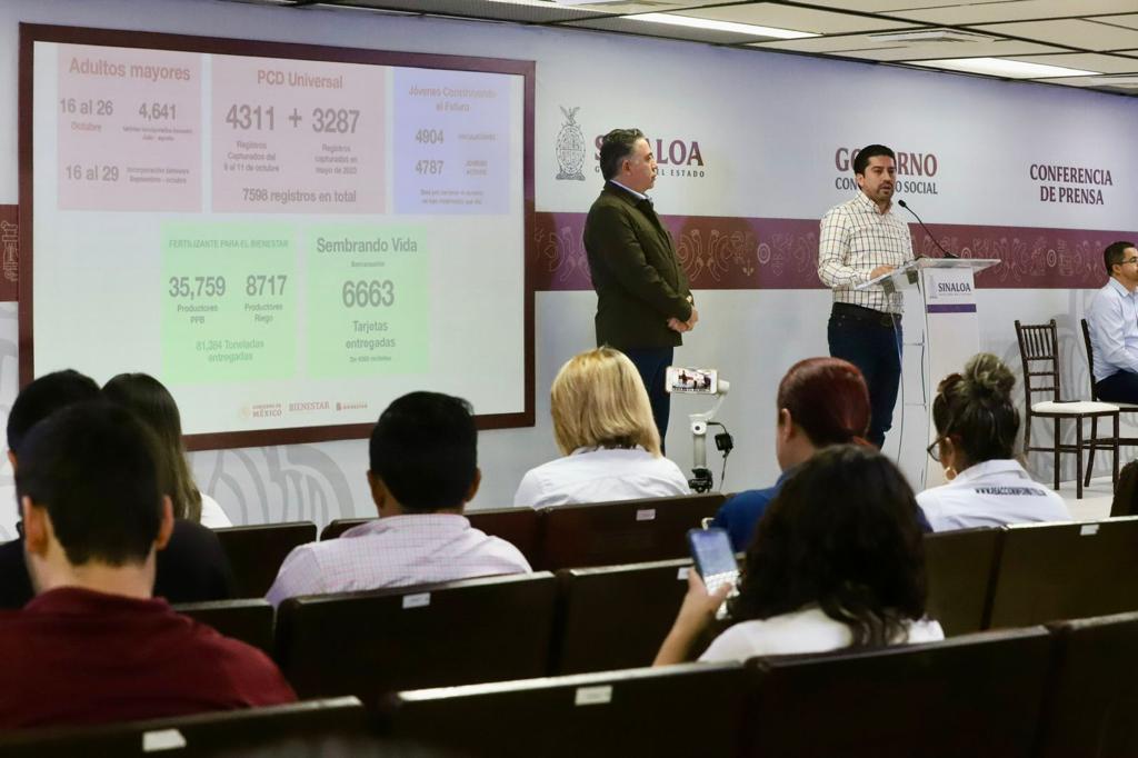 Culiacán, Sinaloa, octubre del 2023.- En total hasta la fecha, se han atendido a más de 650 mil sinaloenses con una dispersión directa y sin intermediarios de más de 10 mil millones de pesos, así lo destacó el delegado de Programas para el Bienestar Omar López Campos en la Conferencia Semanera del Gobernador Rubén Rocha Moya, que en esta ocasión encabezó el secretario general de Gobierno Enrique Inzunza Cázarez.