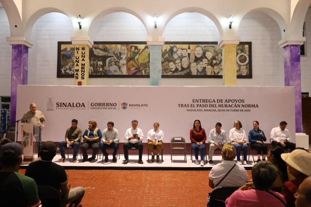 Navolato, Sinaloa, a octubre de 2023*.- Este jueves el Gobernador de Sinaloa Dr. Rubén Rocha Moya estuvo en el patio del H. Ayuntamiento de Navolato junto a la alcaldesa Margoth Urrea Pérez y funcionarios federales, estatales y municipales, para hacer entrega de los primeros apoyos económicos a familias afectadas del municipio de Navolato, tras el paso de la tormenta tropical Norma.