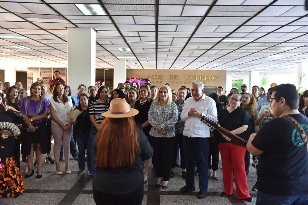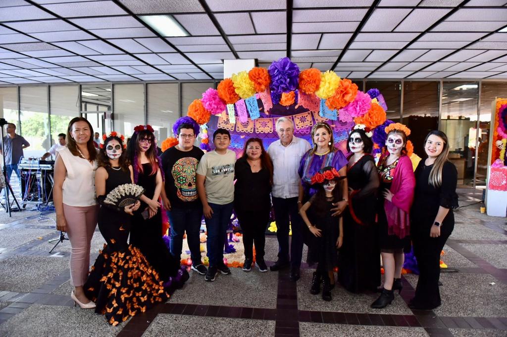 Culiacán, Sinaloa, noviembre de 2023.- El gobernador Rubén Rocha Moya acompañado junto a parte de su gabinete realizó un recorrido por la exposición de altares en el marco de la celebración del día de muertos en planta baja del Palacio de Gobierno del Estado de Sinaloa.