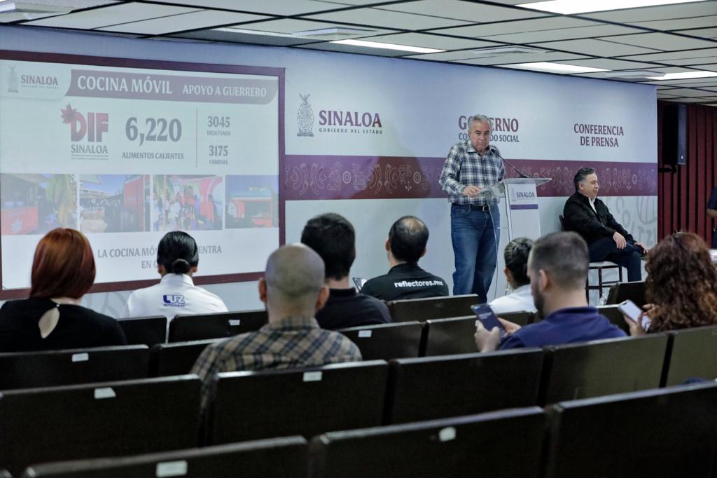 Culiacán, Sinaloa, a noviembre de 2023. – Durante su Conferencia Semanera, el gobernador Rubén Rocha Moya dio a conocer los apoyos enviados a Acapulco a través del Sistema DIF Sinaloa para apoyar a los damnificados del huracán “Otis”, en los que se incluyen 6 mil 220 alimentos calientes, divididos en 3 mil 45 desayunos y 3 mil 175 comidas, entregados por medio de la cocina móvil ubicada en Caleta.