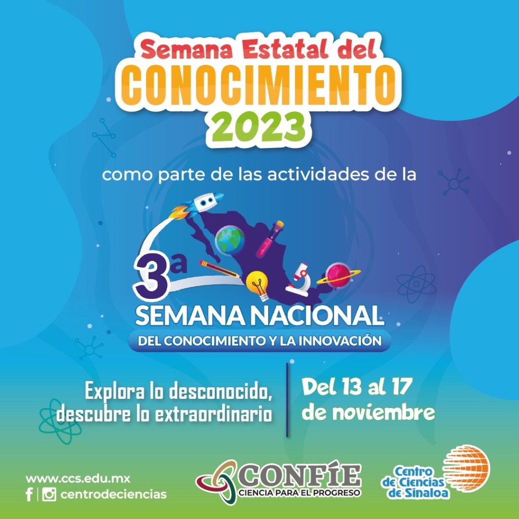 Señaló que, como parte de la 3ª. Semana Nacional del Conocimiento y la Innovación, que tiene como lema “Explora lo desconocido, descubre lo extraordinario” y es organizada por la Red Nacional de Consejos y Organismos de Ciencia y Tecnología (REDNACECYT), CONFÍE a través del Centro de Ciencias de Sinaloa y en colaboración con 20 instituciones educativas llama a participar en la feria estatal que contará con 764 actividades en diversas sedes.