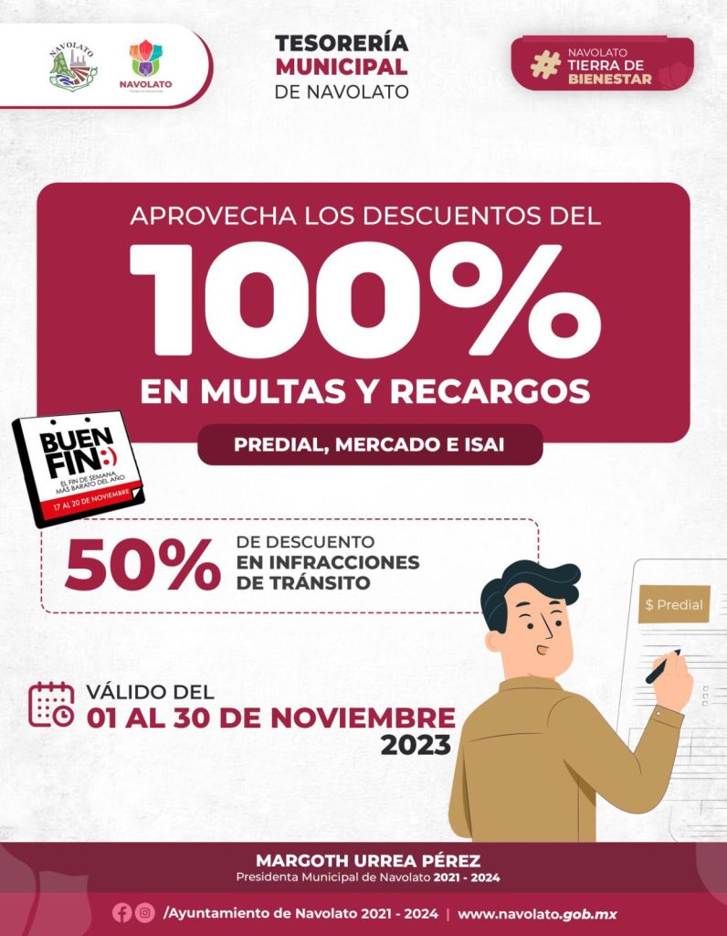 El H. Ayuntamiento de Navolato que preside la alcaldesa Margoth Urrea Pérez, lanzó la campaña de 100% en multas y recargos del Predial, Mercado e ISAI, la cual tiene la finalidad de contribuir a la economía de las familias navolatenses.