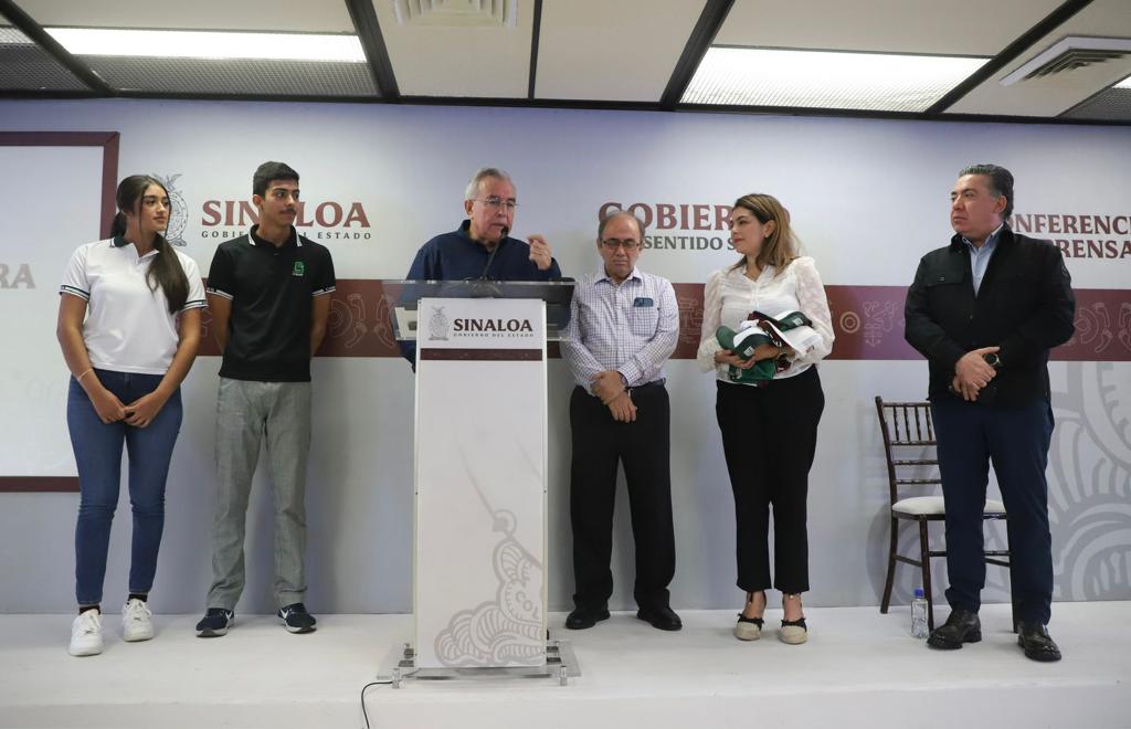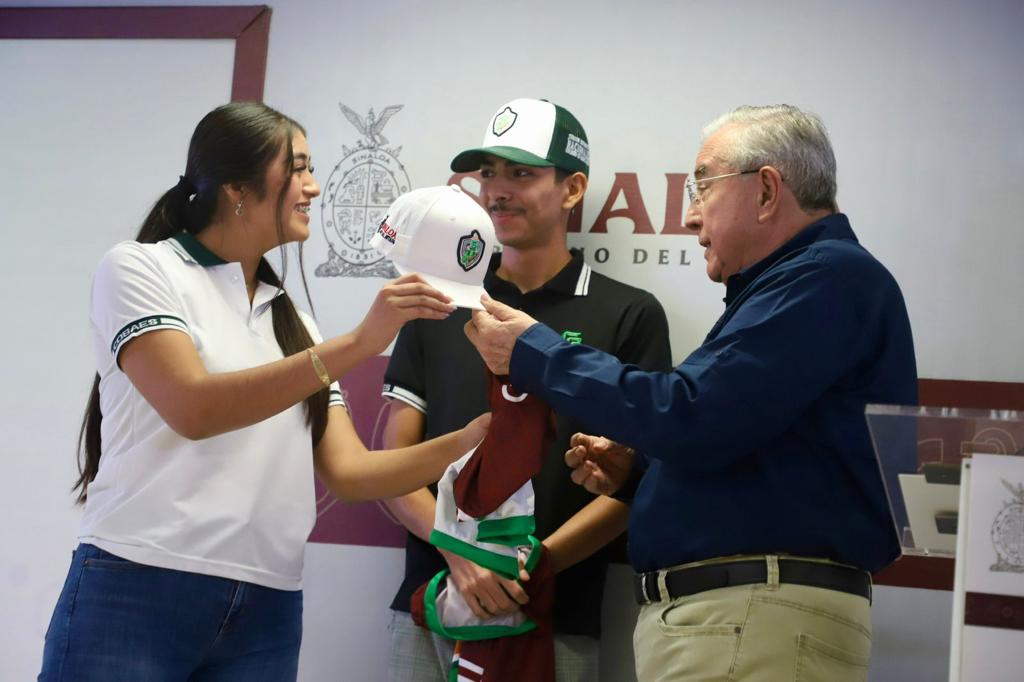 El director general y la directora de vinculación de COBAES presentaron los uniformes oficiales que estarán utilizando los participantes, y el gobernador Rubén Rocha Moya hizo la entrega a los alumnos Alma Victoria Vega Román (Jugadora de sóftbol – Plantel 27) y José Paul Salazar Pérez (Atletismo 400 metros planos – Plantel 26).