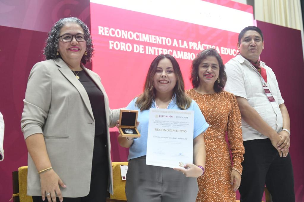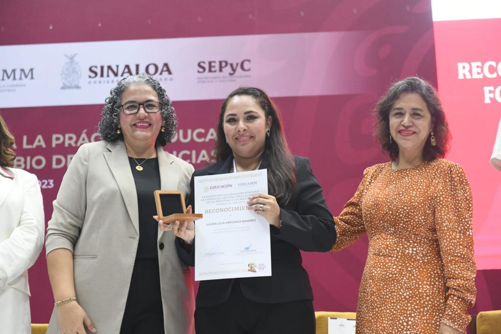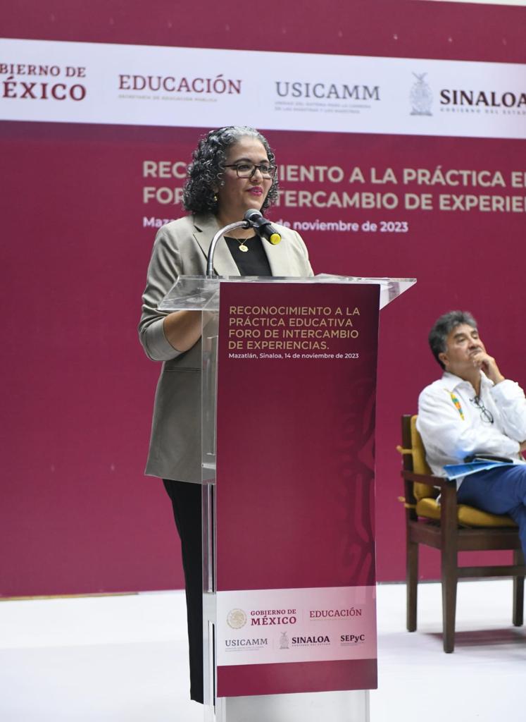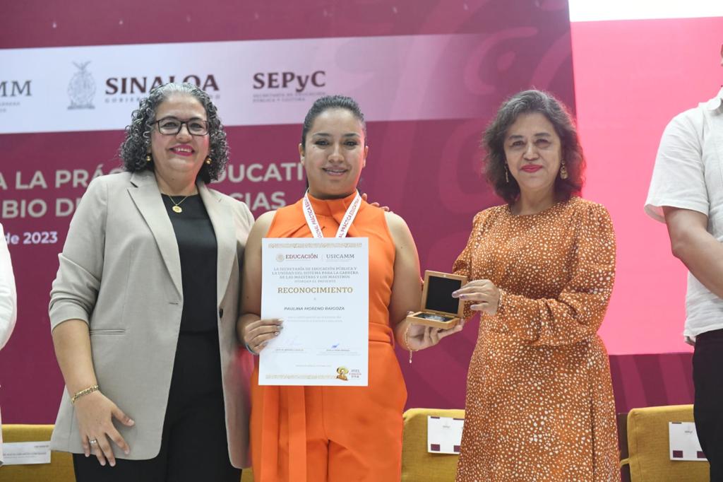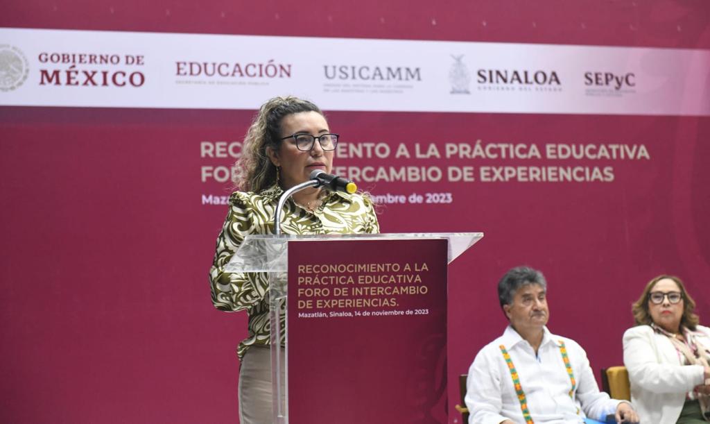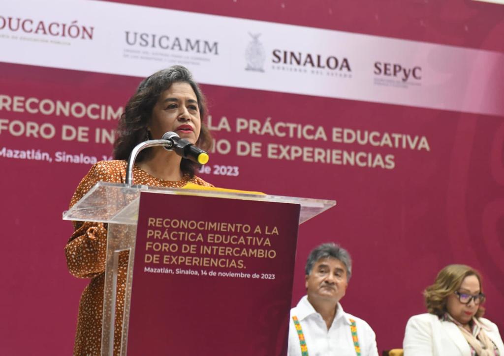 Mazatlán, Sinaloa, a noviembre de 2023*.- Por implementar proyectos creativos y originales y que contribuyen al logro educativo de sus alumnos, 154 maestras y maestros del noroeste del país recibieron Reconocimiento y Medalla, -de ellos 106 son de Sinaloa- durante el Foro Regional de Intercambio de Experiencias y Reconocimiento a las prácticas educativas innovadoras en el ciclo escolar 2022-2023, de mano de la Secretaria de Educación Pública y Cultura, Graciela Domínguez Nava, y la titular de la Unidad del Sistema para la Carrera de las Maestras y los Maestros (USICAMM), Adela Piña Bernal, donde participaron docentes de Durango, Sonora, Baja California, Baja California Sur, Chihuahua y Sinaloa.