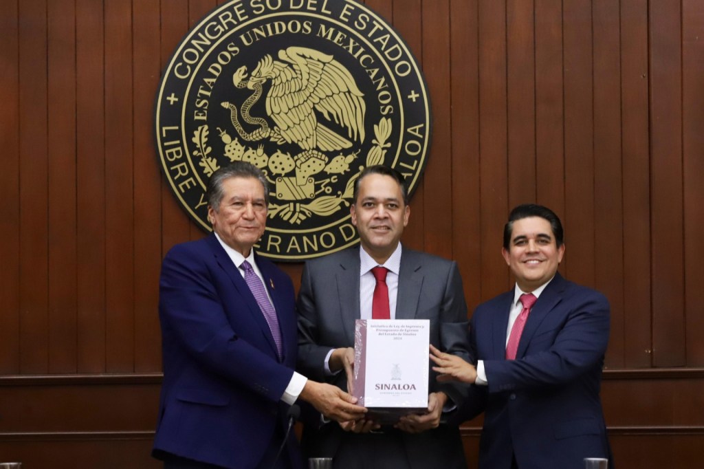 Culiacán, Sinaloa, a noviembre de 2023.- Comisionado por el gobernador Rubén Rocha Moya, el secretario de Administración y Finanzas, Enrique Díaz Vega, entregó a los diputados de la LXIV Legislatura del Congreso del Estado, la iniciativa de Ley de Ingresos y Presupuesto de Egresos para el ejercicio fiscal 2024, que contempla una erogación de 69 mil 596 millones de pesos, cantidad superior en un 7.9 por ciento con respecto al recurso autorizado en este año.