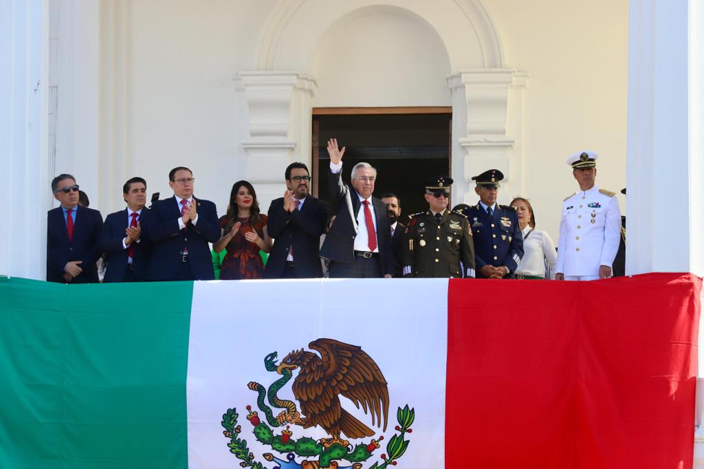 Culiacán, Sinaloa, a Noviembre de 2023.- En el marco del CXIII Aniversario del Inicio de la Revolución Mexicana, esta mañana, el Gobernador Rubén Rocha Moya, acudió al balcón del Palacio Municipal de Culiacán, desde donde presenció el tradicional desfile cívico, deportivo y militar, en compañía del Alcalde Juan de Dios Gámez Mendívil, así como autoridades civiles y militares.