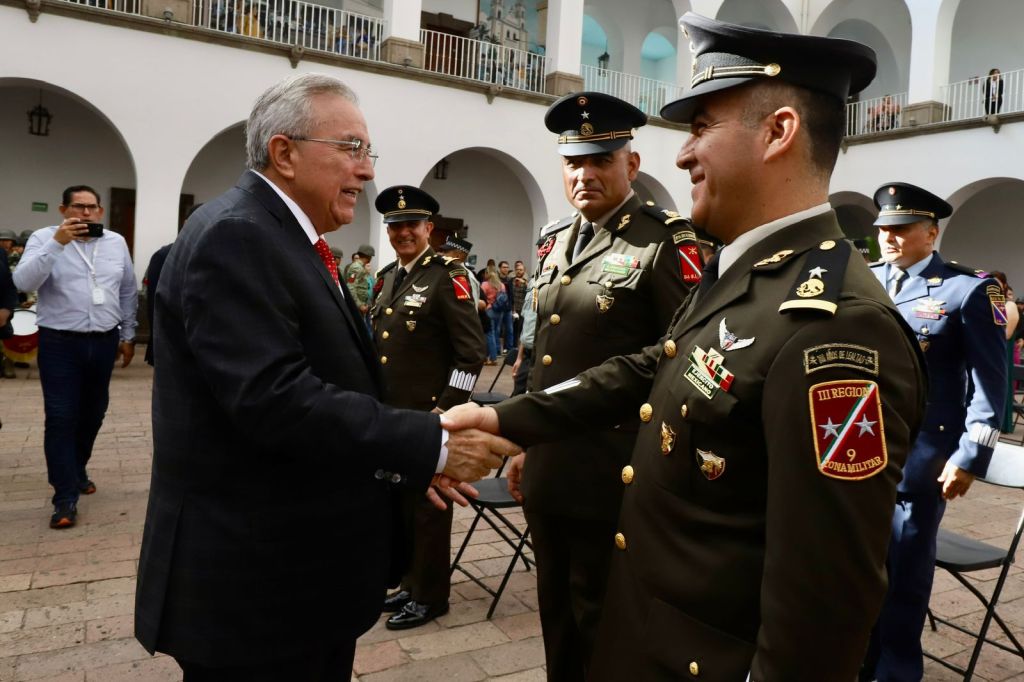 Previo al desfile, el mandatario estatal atestiguó la ceremonia de imposición de ascensos y promociones a personal militar.