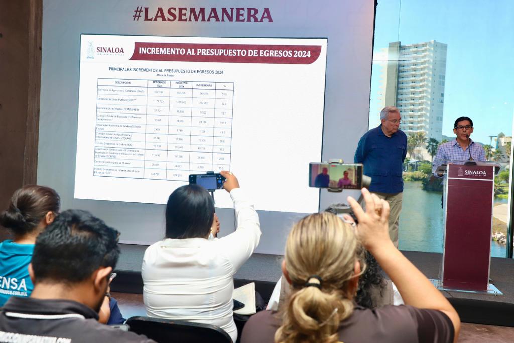 Mazatlán, Sinaloa, a Noviembre de 2023.- Considerando un incremento de 7.89% respecto de las cifras del año anterior, la iniciativa de Ley de Ingresos y Presupuesto de Egresos 2024 de Gobierno del Estado, contempla incrementos en rubros de gran importancia como obra pública, agricultura y búsqueda de personas desaparecidas, detalló el Gobernador Rubén Rocha Moya al precisar el contenido de esta propuesta financiera para el siguiente año, durante su Conferencia Semanera que en esta ocasión se realizó desde las instalaciones del Gran Acuario Mazatlán «Mar de Cortés», un espacio turístico referente a nivel internacional en su categoría.