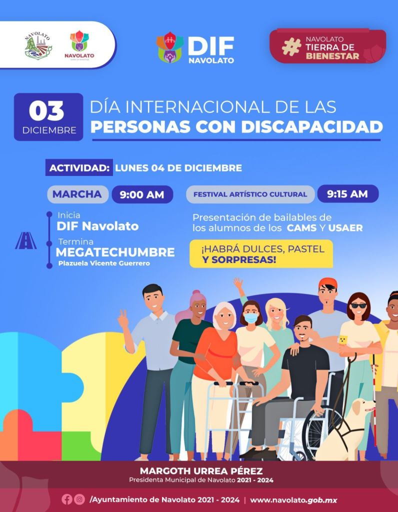 Las y los invitamos a diversas actividades que se llevarán a cabo este lunes 04 de diciembre en conmemoración del Día Internacional de las personas con discapacidad. La primera actividad inicia con una marcha desde las instalaciones de DIF NAVOLATO a las 9am. Se contará con la presencia de la Presidenta de DIF Sinaloa, Dra. Eneyda Rocha Ruiz y la Alcaldesa Margoth Urrea Pérez.