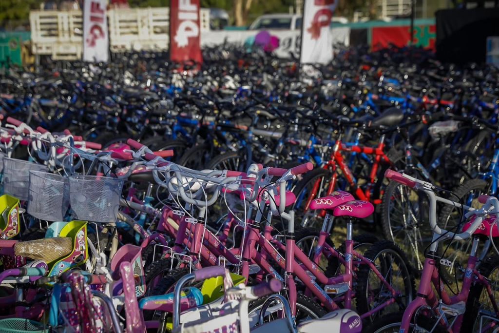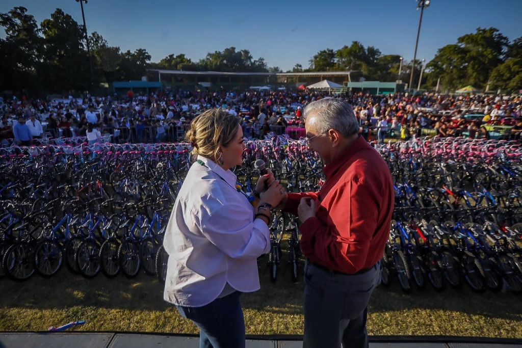 «A ver Eneyda, ¿qué van a entregar?, para las familias son cobijas, colchonetas, catres, ¿quién quiere catres?, los refrigeradores no, esos se rifan, pero lo que vamos a entregar son enseres y para todas las niñas y los niños ¿el Gobernador qué les va a regalar? ¡Bicicletas!, fíjense bien, a todas y a todos, niñas y niños, se les va a dar su bicicleta de acuerdo con su edad, pero, como estoy viendo tantos, si no llegarán a alcanzar estas, van a entregarles un papelito y en su casa les van a llevar su bicicleta, los que falten, aquí hay 3 mil», expresaron.