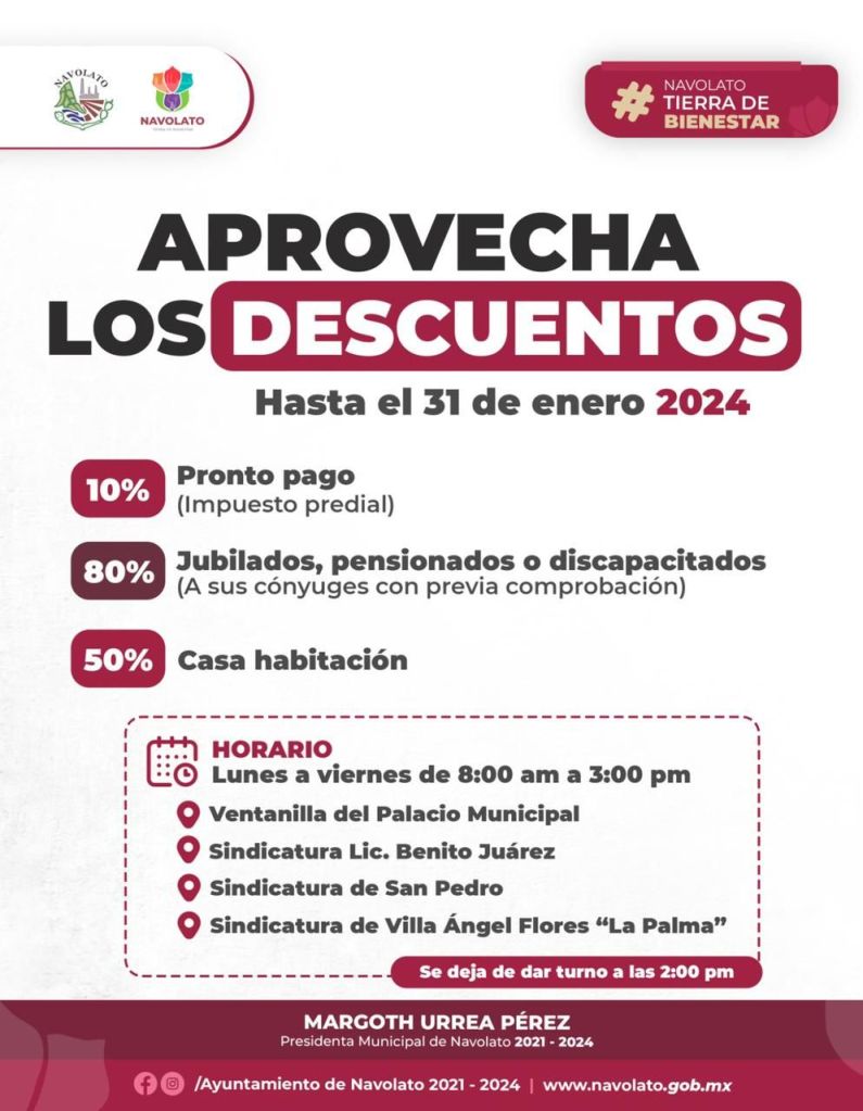 La Presidenta Municipal de Navolato, Margoth Urrea Pérez, invitó a los contribuyentes a aprovechar los descuentos y realizar sus pagos correspondientes, los cuales se podrán realizar en ventanilla del H. Ayuntamiento de Navolato y en algunas sindicaturas de lunes a viernes en un horario de 8:00am a 3:00pm.