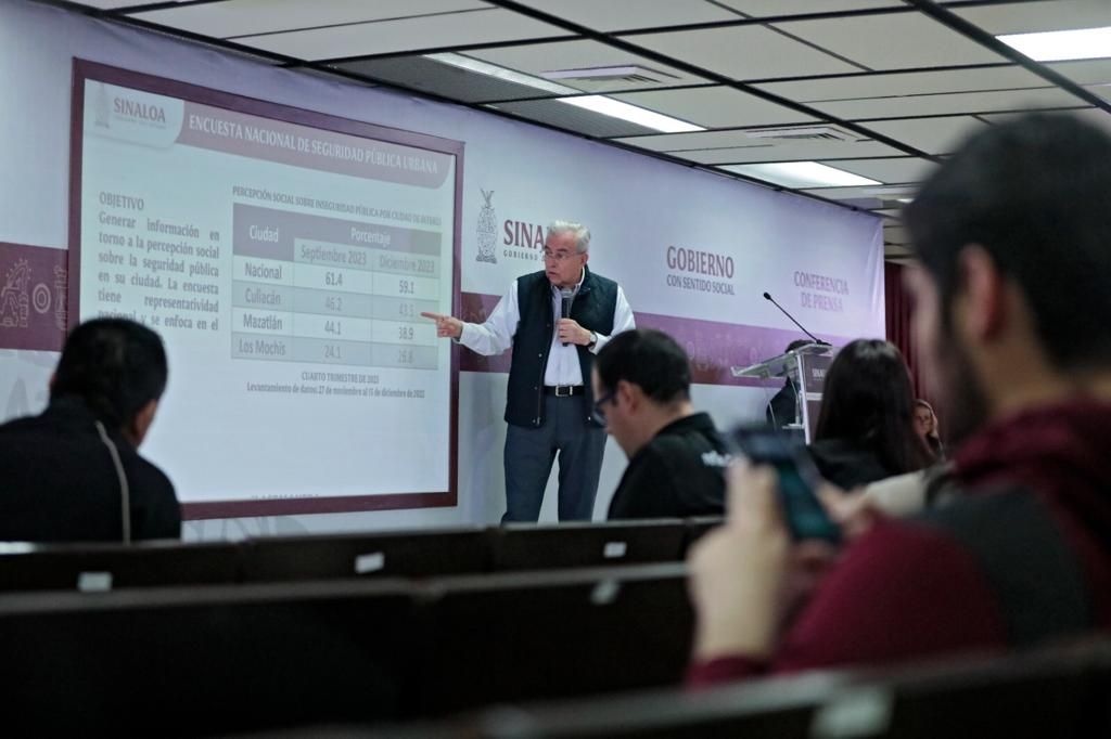 «Al 31 de diciembre de este 2023, la percepción nacional según INEGI y su encuesta, bajó de 61.4 a 59.1. En Culiacán bajó de 46.2 a 43.5. Sinaloa está en sus principales ciudades por debajo de la media. En Mazatlán de 44.1 que tuvo en Septiembre la percepción, bajó a 38.9. En Los Mochis de 24.1, subió a 26.8. No deja de ser la percepción más baja en Los Mochis», precisó el Gobernador.
