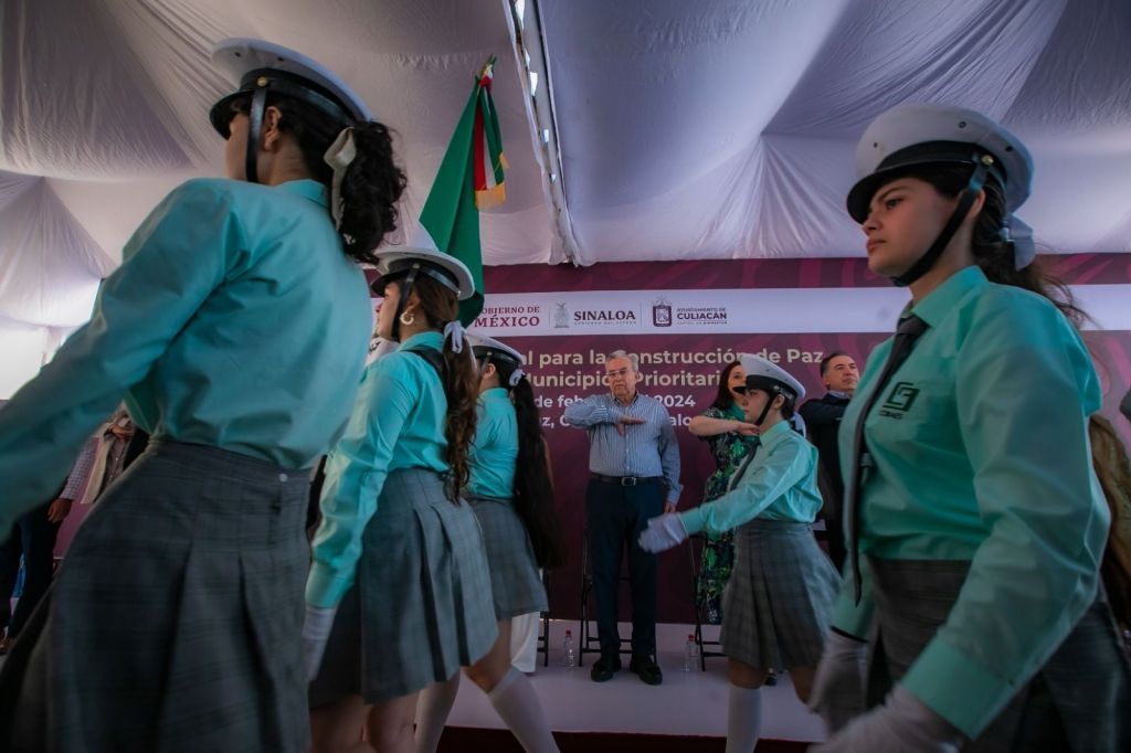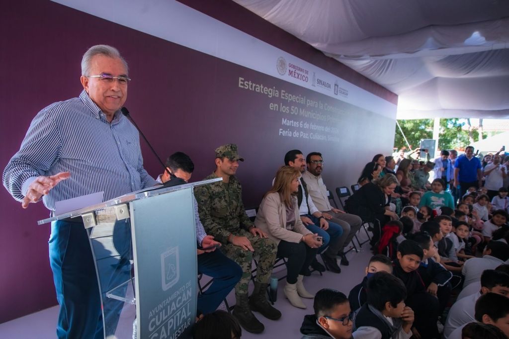 Culiacán, Sinaloa, 06 de febrero del 2024.- El gobernador Rubén Rocha Moya inauguró la Feria de La Paz en la colonia Lázaro Cárdenas, evento organizado por la SSyPC Federal como parte de la Estrategia Especial para la Construcción de la Paz en los 50 Municipios prioritarios, que tiene como fin establecer y fomentar la seguridad pública en la sociedad.
