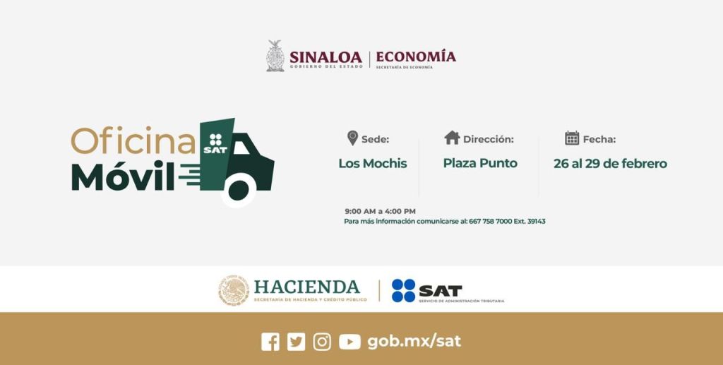 Detalló que la Oficina Móvil del SAT estará en Plaza Punto de Los Mochis y atenderá en un horario de 09:00 de la mañana a 03:00 de la tarde con los siguientes servicios: