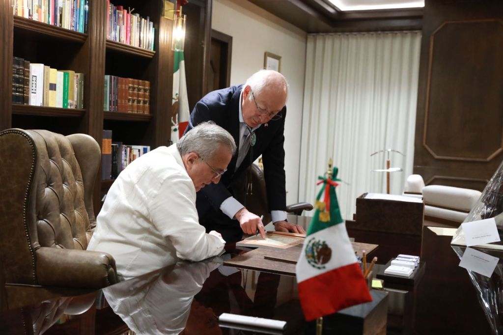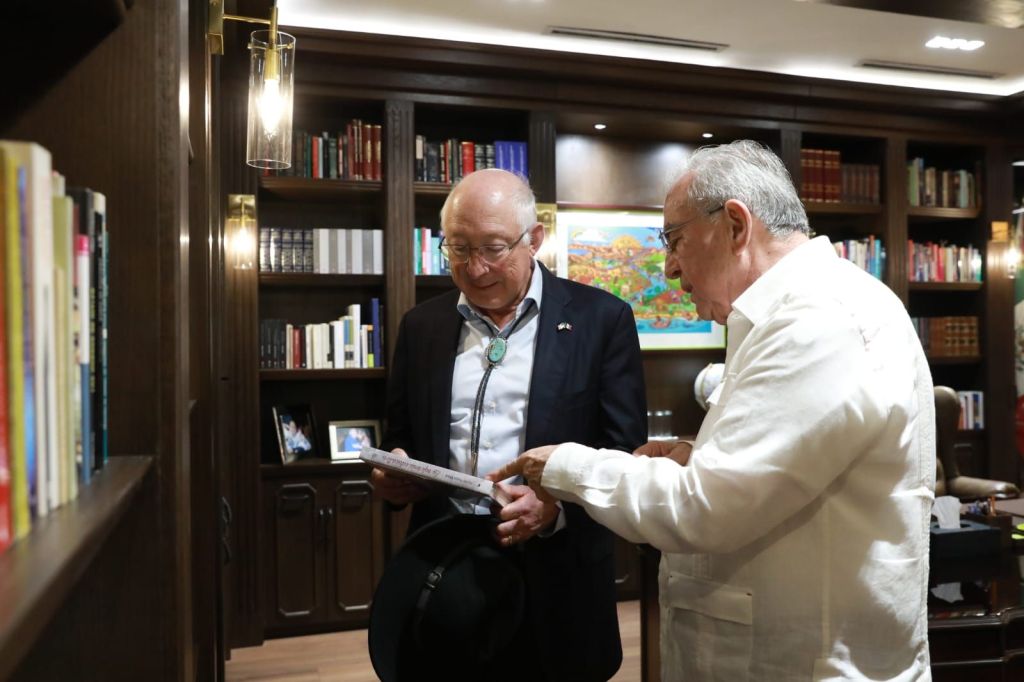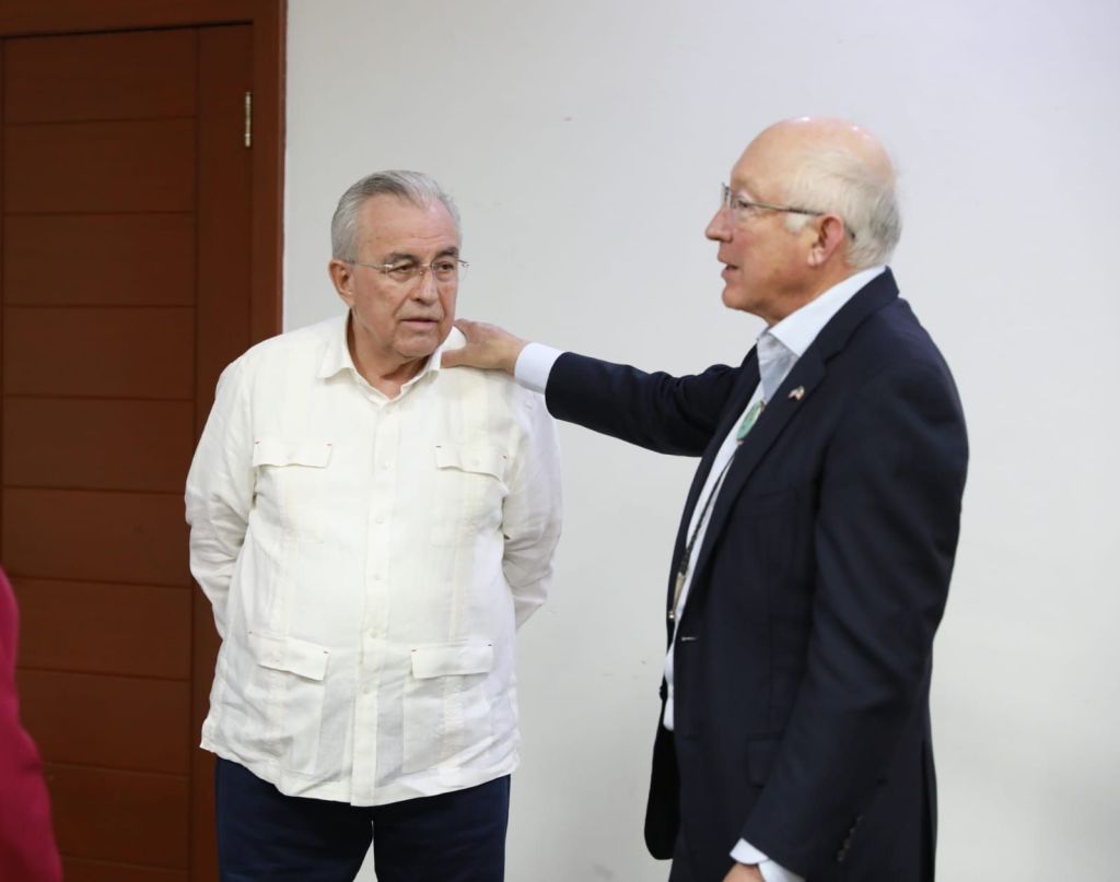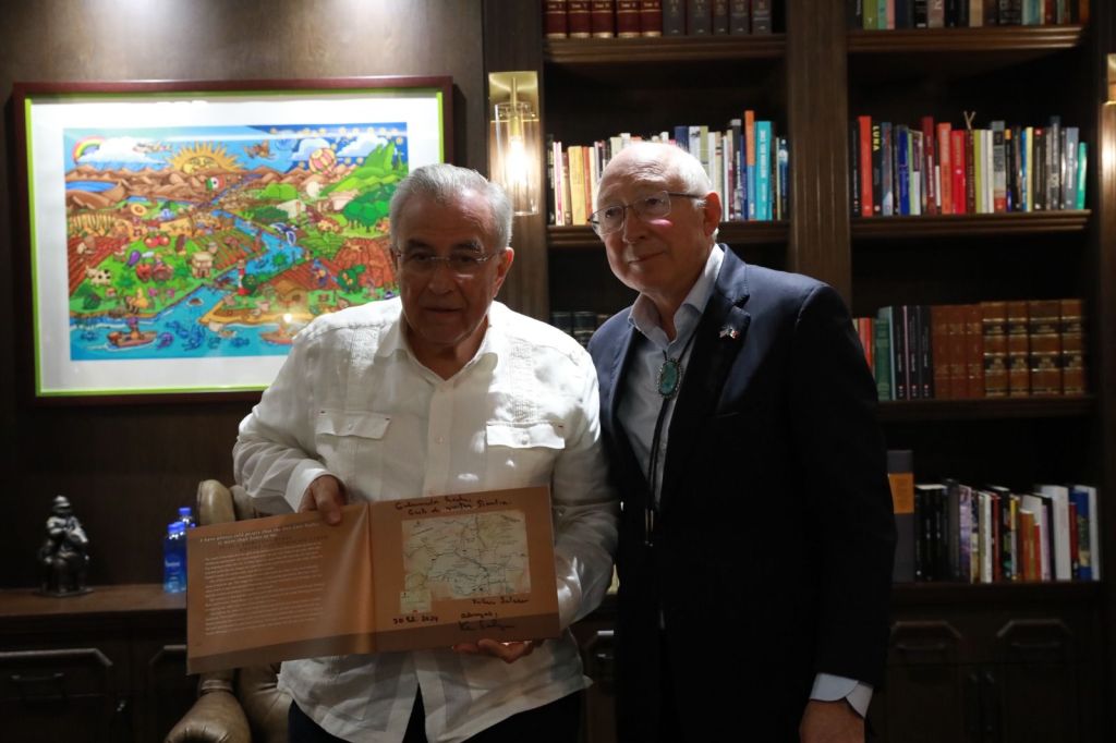 Culiacán, Sinaloa; febrero de 2024.- El Gobernador Rubén Rocha Moya recibió esta tarde en Palacio de Gobierno, al Embajador de Estados Unidos en México Ken Salazar, quien en reconocimiento a la importante aportación del campo Sinaloense al sector alimentario, asistirá mañana al inicio de la edición número 32 de la Expoagro.