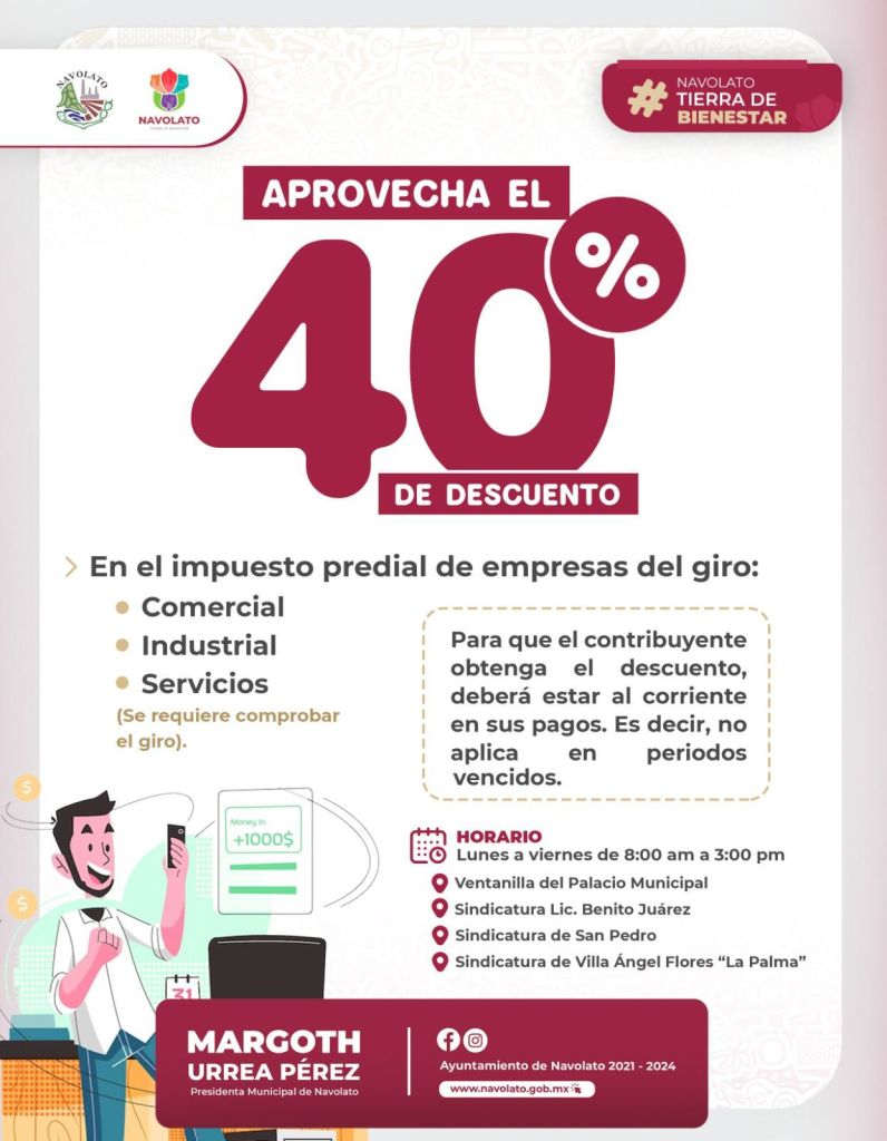 Navolato, Sinaloa, a jueves 22 de febrero de 2024*.- El H. Ayuntamiento de Navolato que preside la alcaldesa Margoth Urrea Pérez, lanzó una campaña del 40% de descuento en el impuesto predial de empresas del giro comercial, industrial y de servicios que operan en el municipio de Navolato.