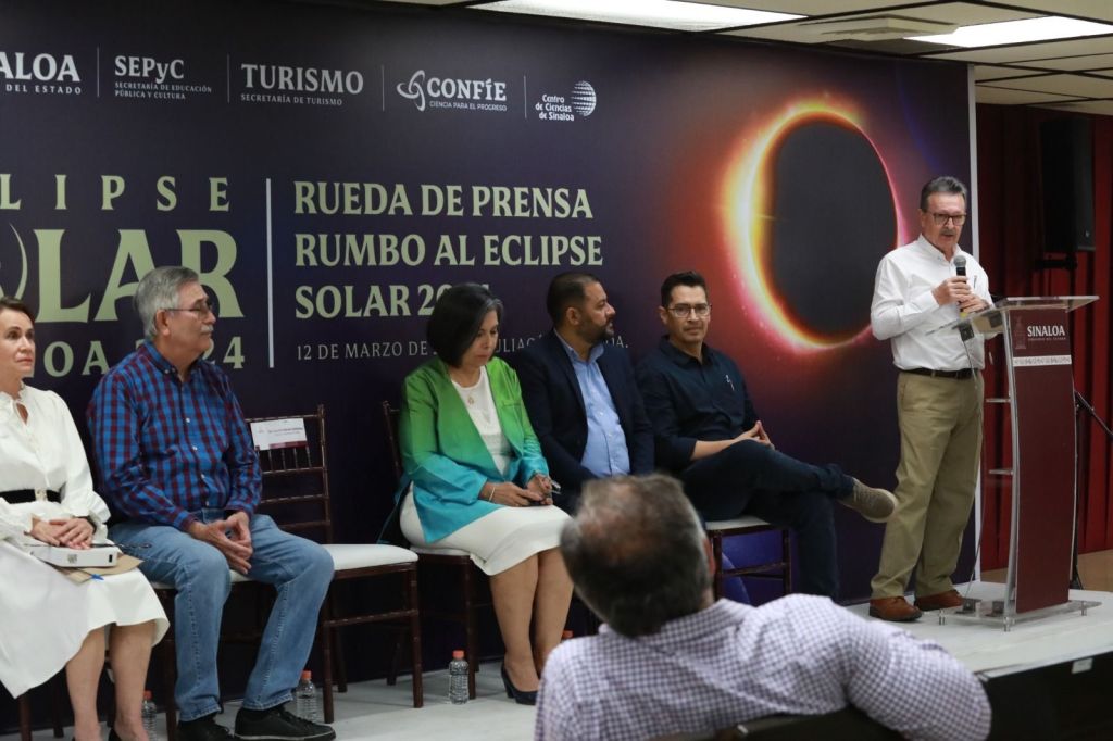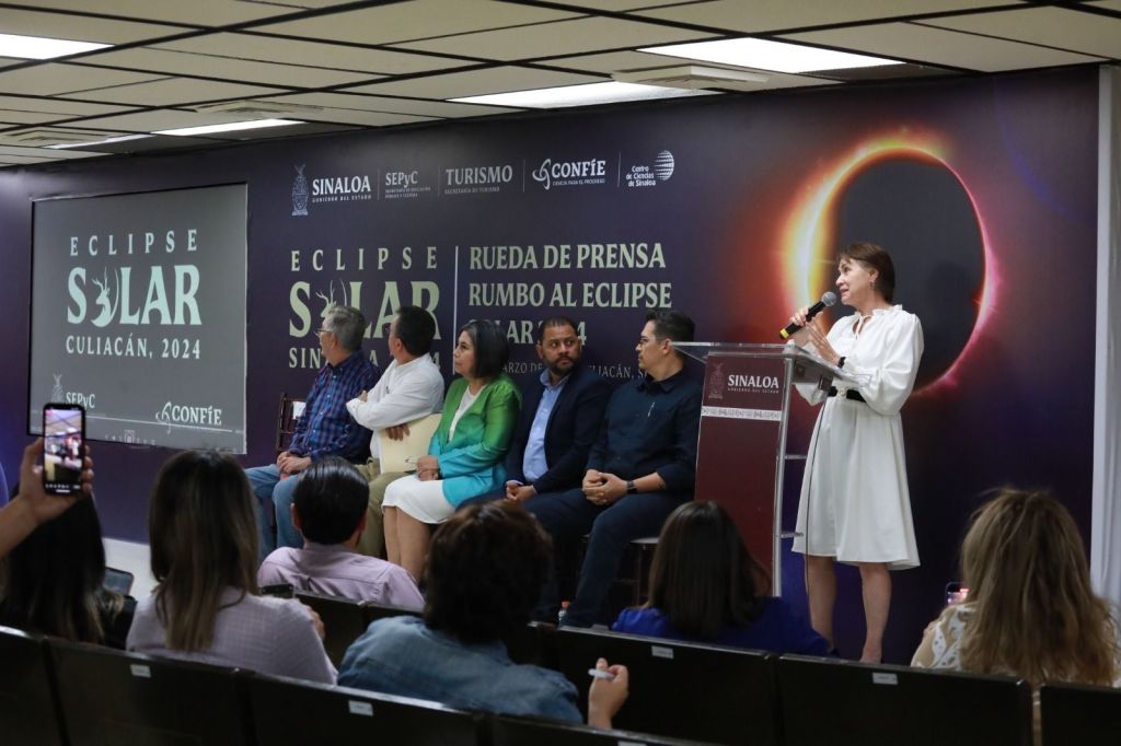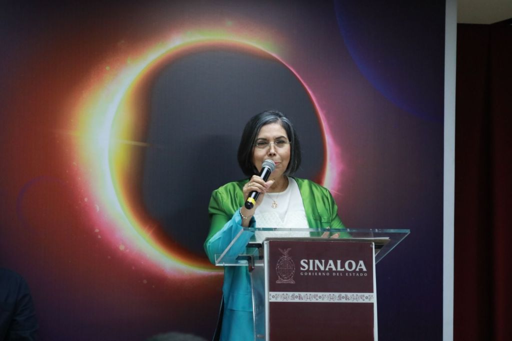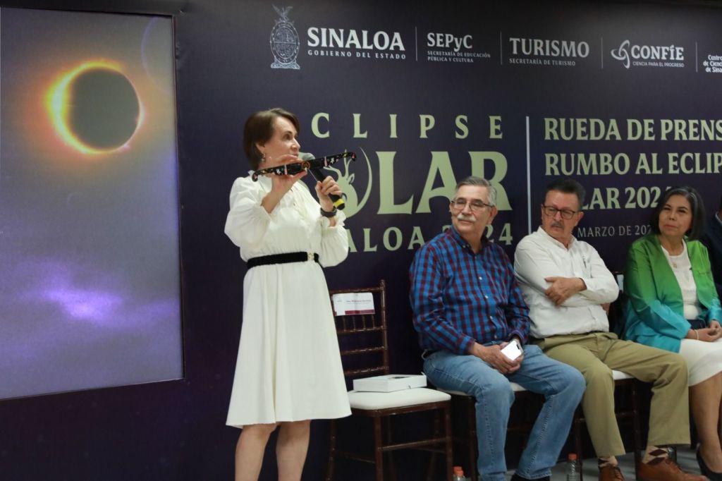 Culiacán, Sinaloa, a 12 de Marzo de 2024.- Con el objetivo de promover acciones y actividades educativas para observar de manera segura y responsable el eclipse total de sol que tendrá lugar el próximo 08 de abril del año en curso, el Gobierno del Estado de Sinaloa a través de la Secretaría de Educación Pública y Cultura, en coordinación con CONFÍE, a través del Centro de Ciencias de Sinaloa, implementarán el Taller de Formación «Eclipses Solares», en modalidad virtual, dirigido a personal docente frente a grupo de las escuelas de educación básica, informó en rueda de prensa Catalina Esparza Navarrete, encargada del Despacho de la Secretaría de Educación Pública y Cultura.