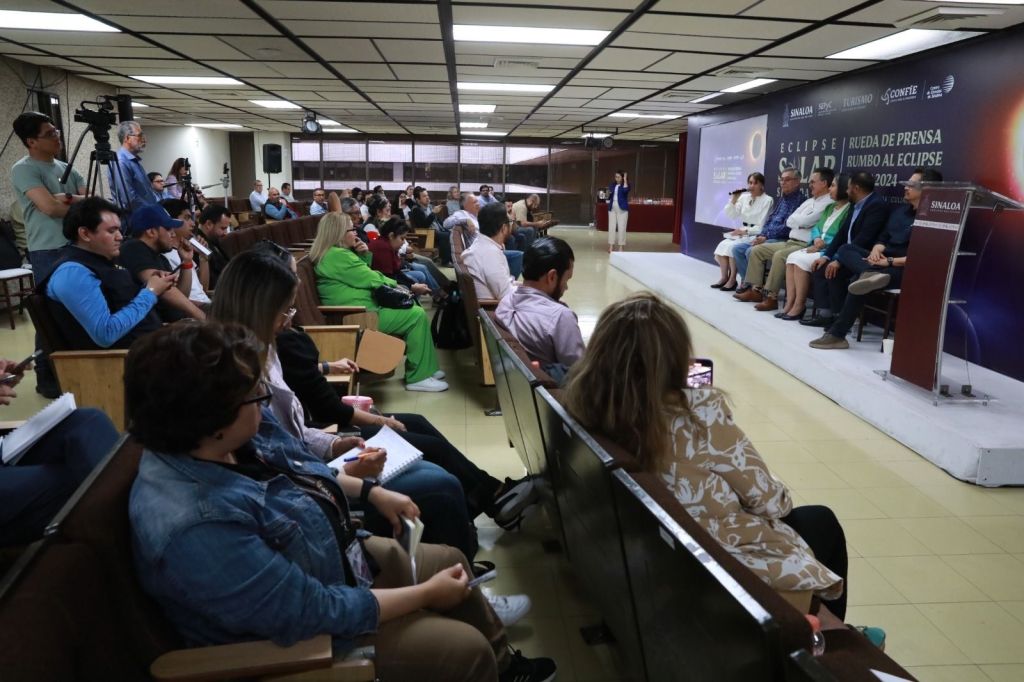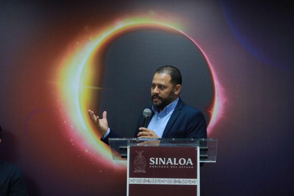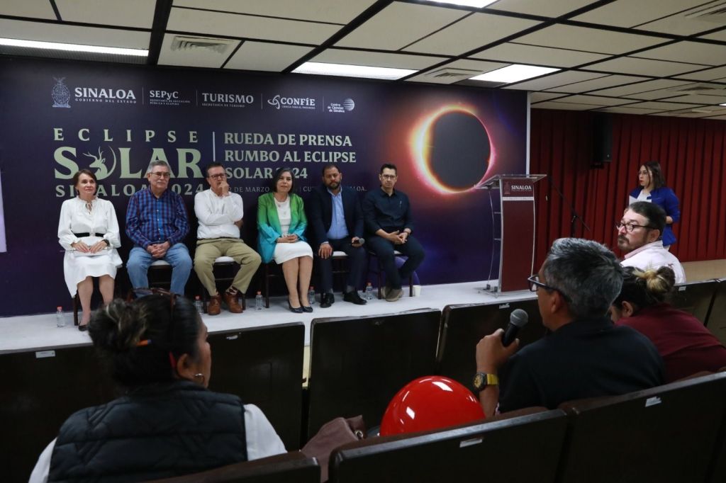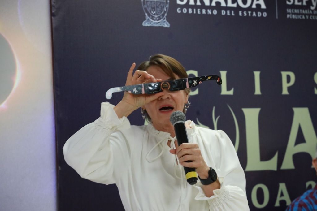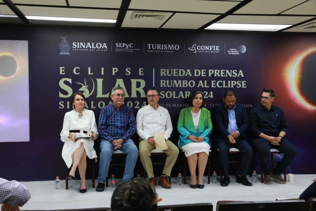 Culiacán, Sinaloa, a 12 de Marzo de 2024.- Con el objetivo de promover acciones y actividades educativas para observar de manera segura y responsable el eclipse total de sol que tendrá lugar el próximo 08 de abril del año en curso, el Gobierno del Estado de Sinaloa a través de la Secretaría de Educación Pública y Cultura, en coordinación con CONFÍE, a través del Centro de Ciencias de Sinaloa, implementarán el Taller de Formación «Eclipses Solares», en modalidad virtual, dirigido a personal docente frente a grupo de las escuelas de educación básica, informó en rueda de prensa Catalina Esparza Navarrete, encargada del Despacho de la Secretaría de Educación Pública y Cultura.