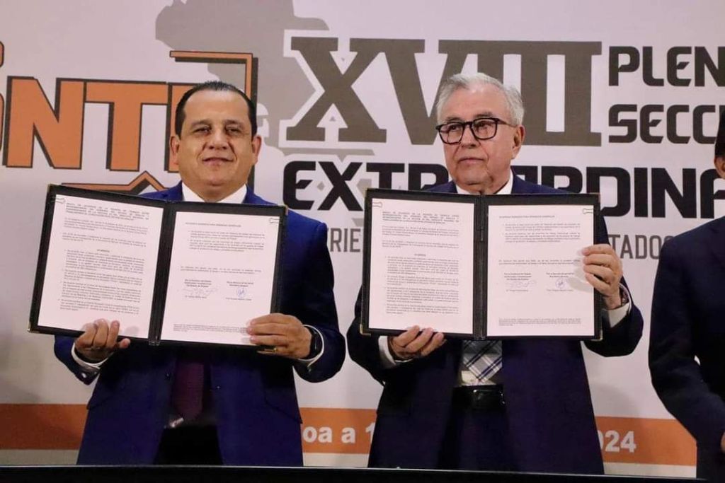 En el marco del Décimo Octavo Pleno Seccional Extraordinario, el Secretario de la Sección 53 del SNTE, Mtro. Ricardo Madrid Uriarte, y el Gobernador, Dr. Rubén Rocha Moya, han firmado esta mañana compromisos encaminados a la salvaguarda de los derechos laborales y prestacionales de los agremiados al SNTE 53.Una vez firmados los acuerdos en el auditorio de la Sección 53, el líder magisterial agradeció el apoyo del Gobernador y puntualizó que el documento acuerda una serie de beneficios específicos. Entre ellos, se continuará con las reuniones de trabajo institucional cuando se requiera, para dar seguimiento a los acuerdos y fortalecer el espacio de diálogo propositivo que ha permitido avanzar en la solución de anejas y complejas problemáticas.