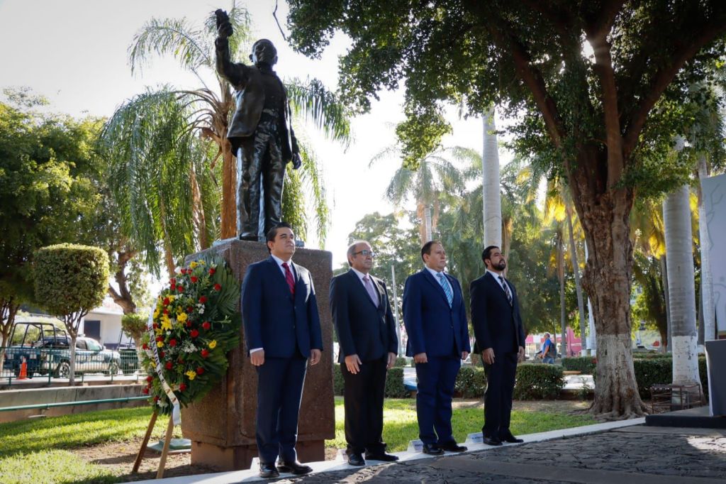 Tras la finalización del evento, las autoridades presentes se desplazaron al monumento del primer presidente indígena de México, ubicado en la zona norte de la plaza cívica de Palacio de Gobierno, en donde se montó una Guardia de Honor, con el toque marcial Tres de Diana a cargo de la Banda de Guerra y Escolta del COBAES 25 “Gral. Salvador Alvarado”, de Culiacán.