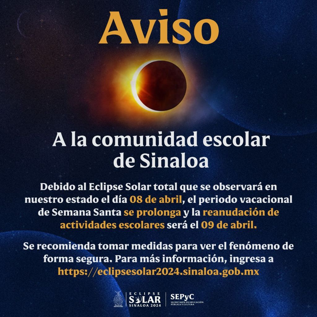 Culiacán, Sinaloa; 22 de marzo de 2024.-* Para garantizar la seguridad de las y los niños de Educación Básica durante el Eclipse Solar Total, la Secretaría de Educación Pública y Cultura autorizó que se prolongue el periodo vacacional de Semana Santa, por lo que el regreso a las aulas será hasta el martes 09 de abril.