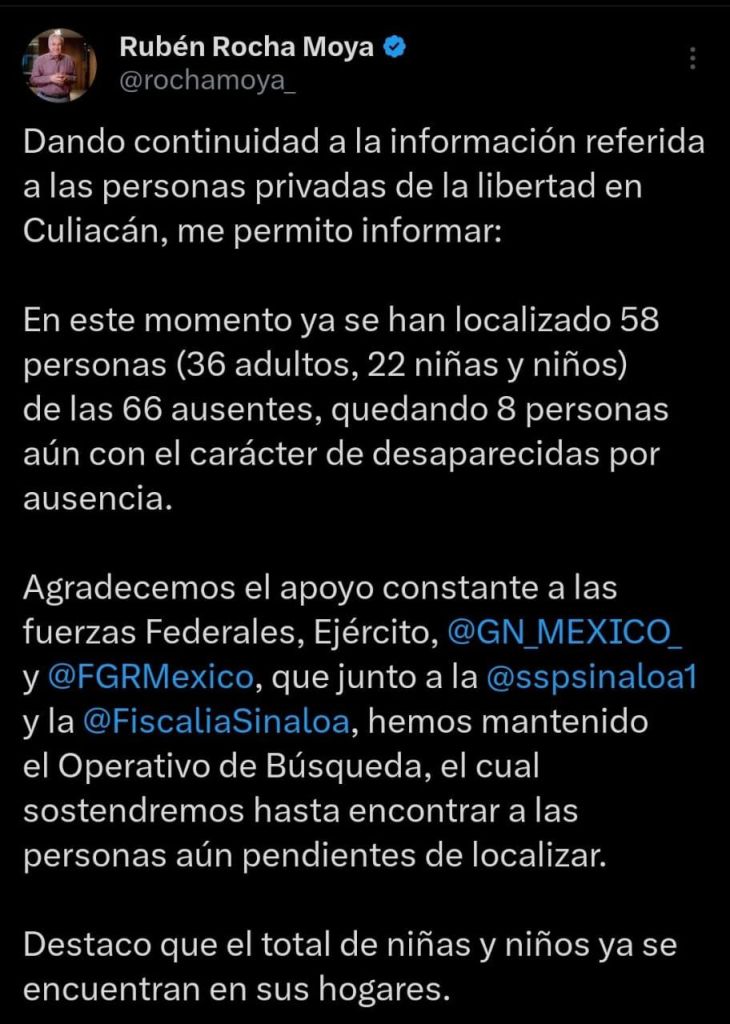 El secretario de Seguridad Pública en Sinaloa, Gerardo Mérida Sánchez, informó que, de las 66 personas que habrían sido privadas de la libertad en Culiacán, 58 ya se encuentran en sus domicilios, en las últimas horas en trabajo de campo, las autoridades han podido corroborar que 16 personas más ya se hicieron presentes en sus viviendas.