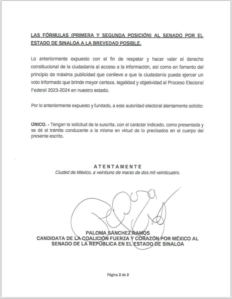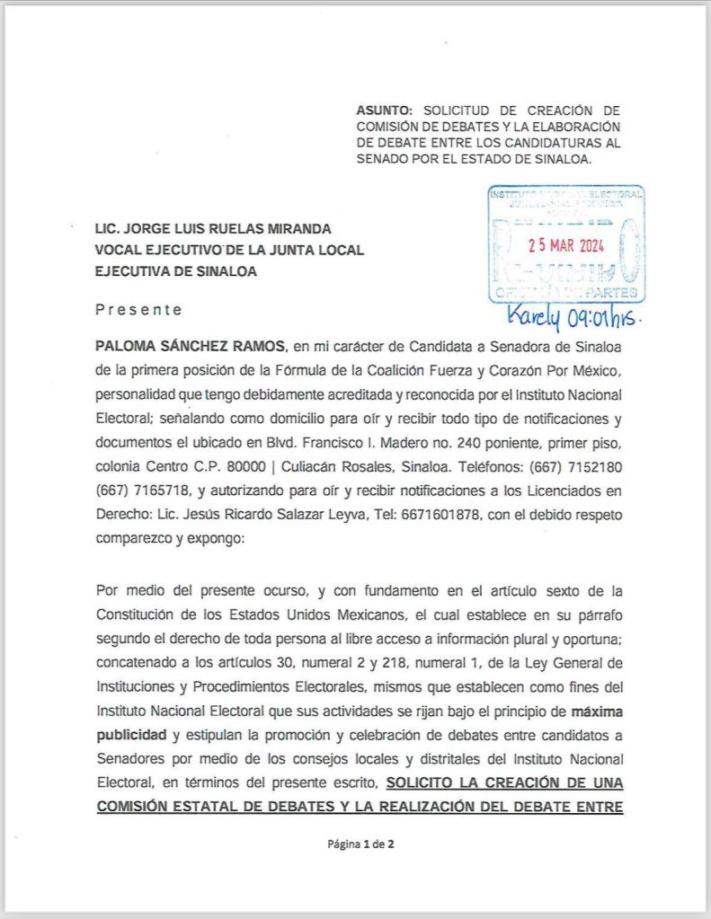 Culiacán, Sin. , lunes 25 de marzo de 2024.- En su carácter de candidata al Senado de la República, Paloma Sánchez, solicitó ante el INE la creación de una Comisión Estatal de Debates para que se realice al menos uno entre los candidatos al Senado por Sinaloa.