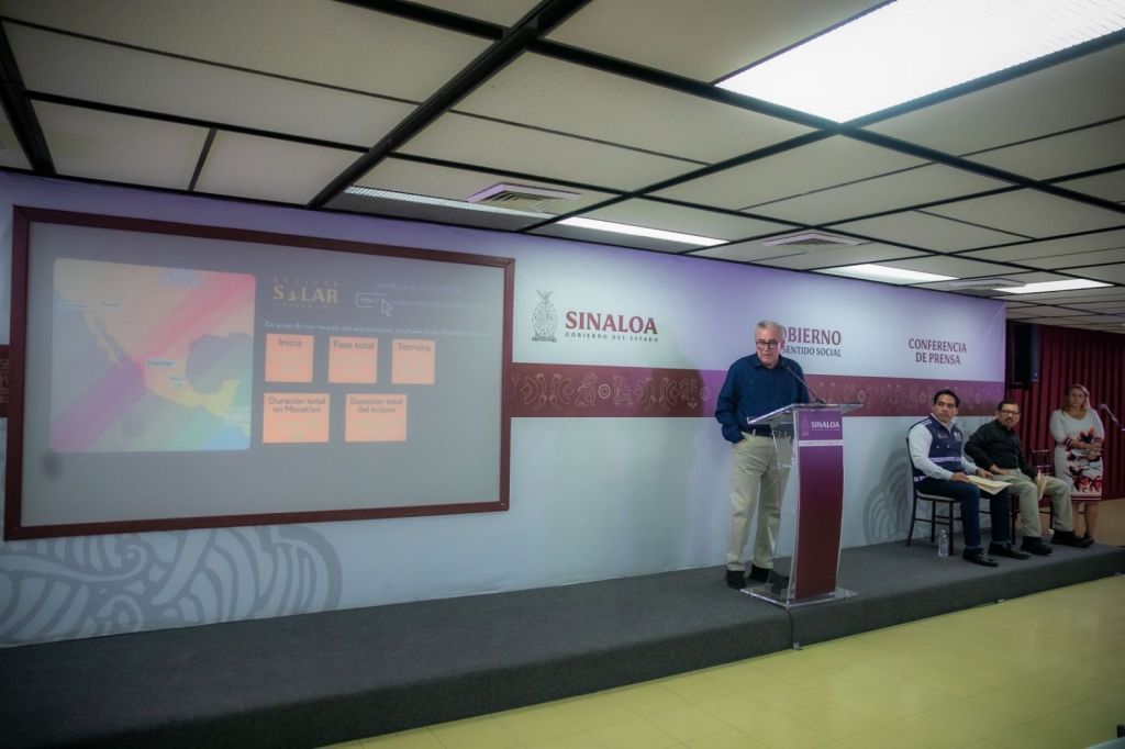Culiacán, Sinaloa, a 01 de abril de 2024.- Durante su Conferencia Semanera, el gobernador Rubén Rocha Moya invitó a presenciar el eclipse solar que se producirá la mañana del lunes 8 de abril, siendo Mazatlán el lugar donde podrá observarse en toda su plenitud de acuerdo con lo declarado por la NASA y la comunidad científica internacional, y para ello, el Gobierno del Estado distribuirá gratuitamente 250 mil lentes certificados a la población, a fin de evitar daños en la visión, pues dicho fenómeno no debe verse directamente sin ningún tipo de protección.