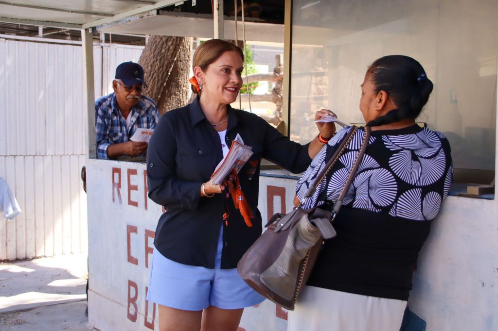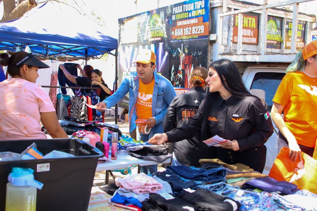 San Miguel Zapotitlán, Ahome, Sinaloa.- La próxima Senadora de la República, por Movimiento Naranja, Fernanda Rivera Romo en su recorrido por los tianguis de San Miguel Zapotitlán, sindicatura de Ahome, en su día 55 de campaña, saludó a los oferentes y clientela que acude al tianguis.