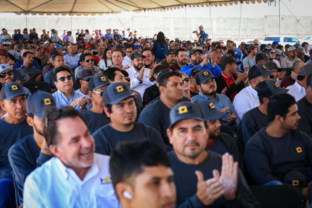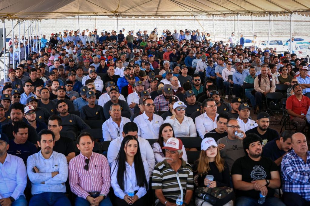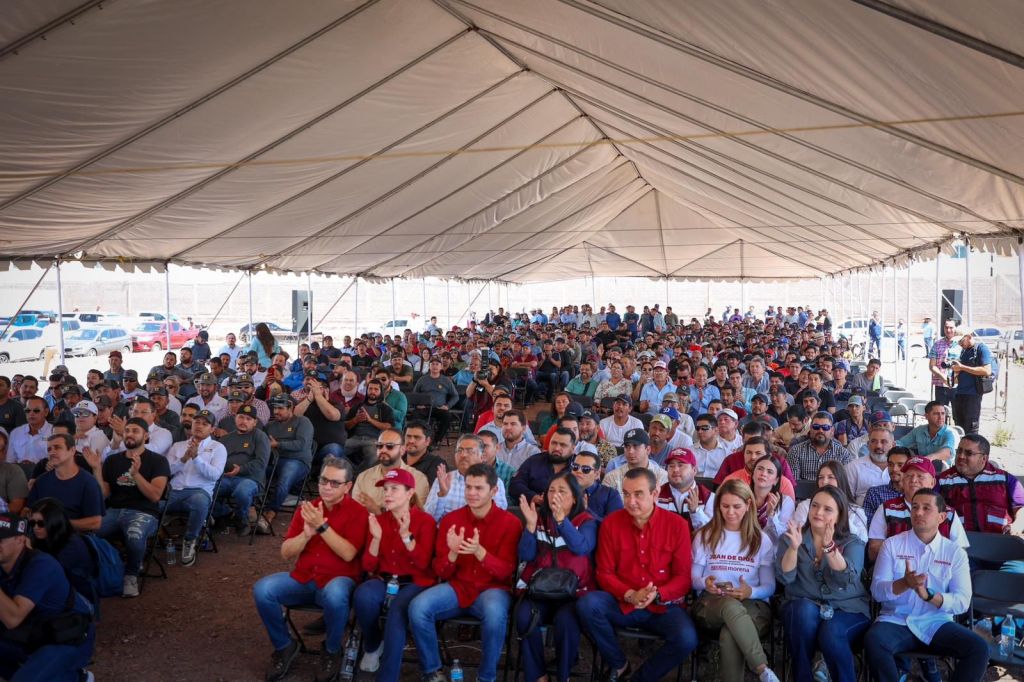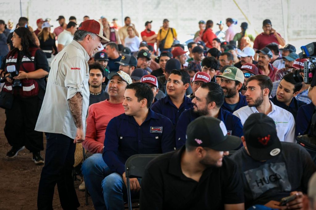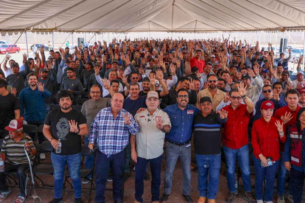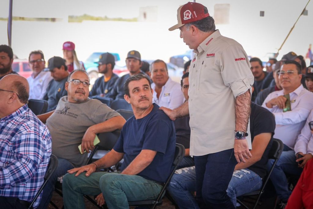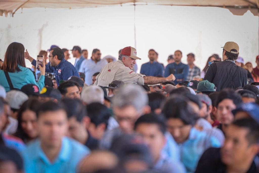 «Ya llegó la cal de piedra y aquí me tienen ahora”, dice Enrique Inzunza ante más de un millar de trabajadores de la pala y la cuchara.
