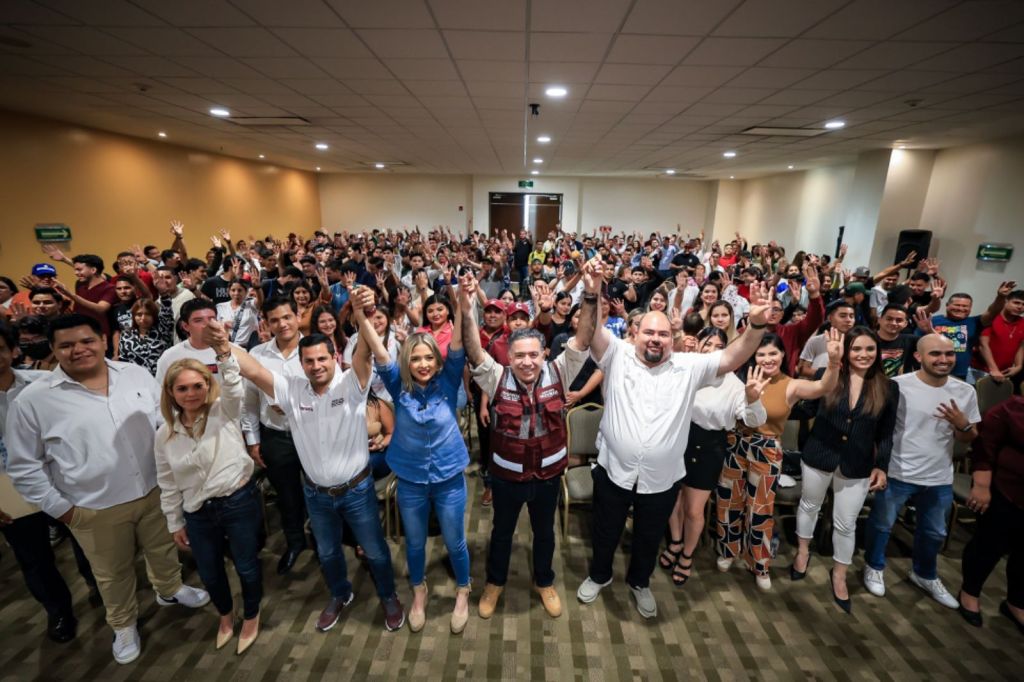 Mazatlán, 17 de mayo de 2024. Los candidatos de Morena, Enrique Inzunza Cázarez aspirante al Senado, Estrella Palacios a la alcaldía de Mazatlán y Carlos Escobar a diputado local por el distrito 21; se reunieron con 400 Jóvenes Emprendedores en la Perla del Pacífico.