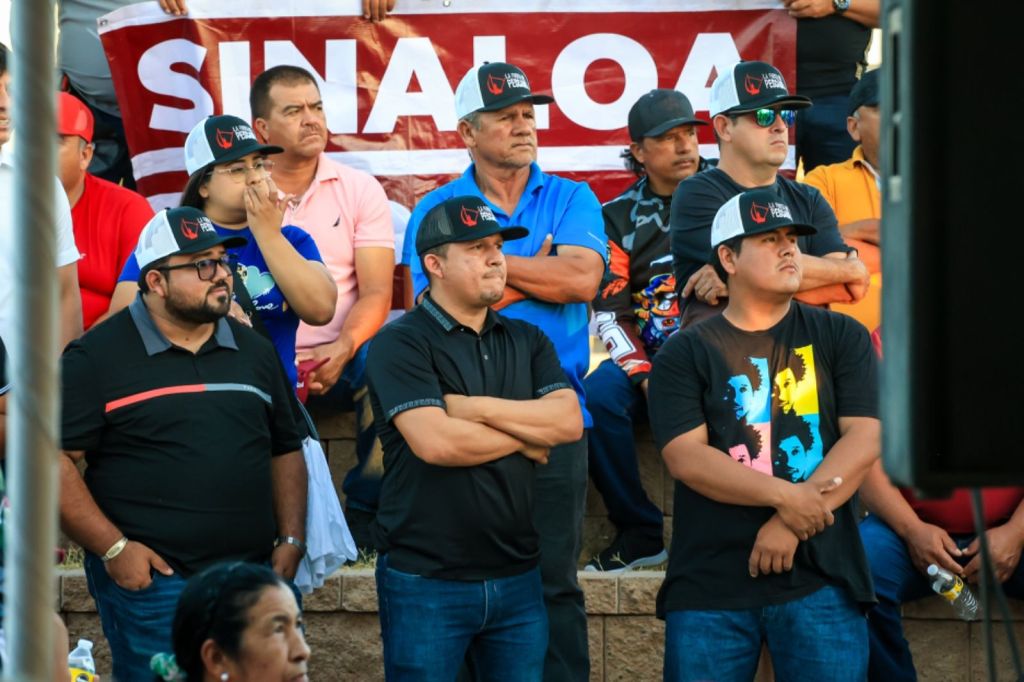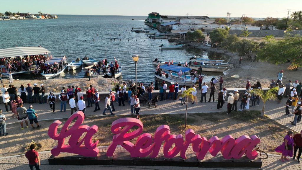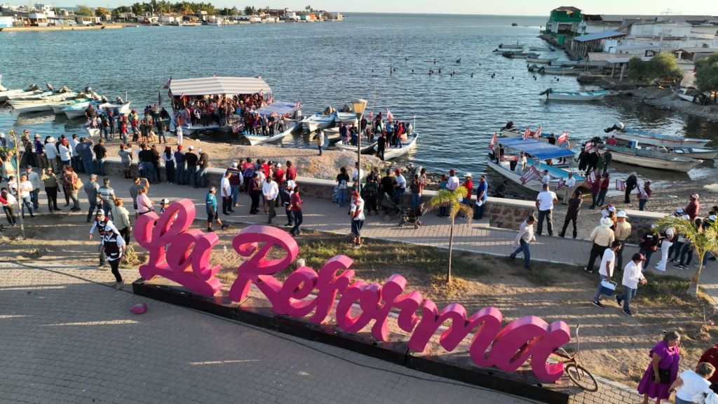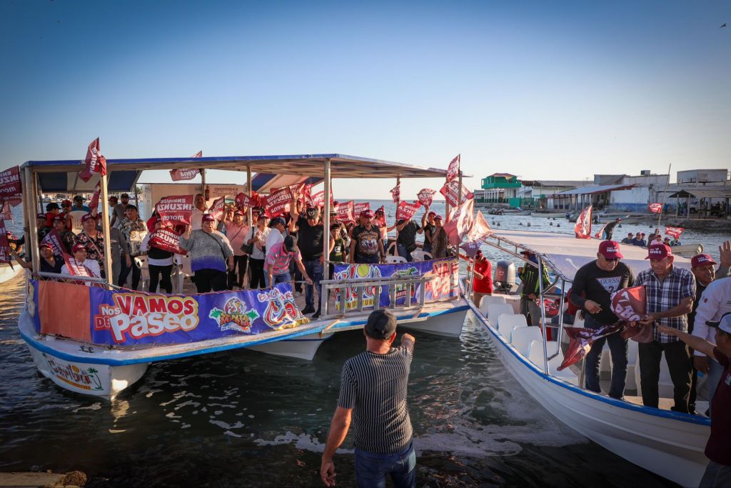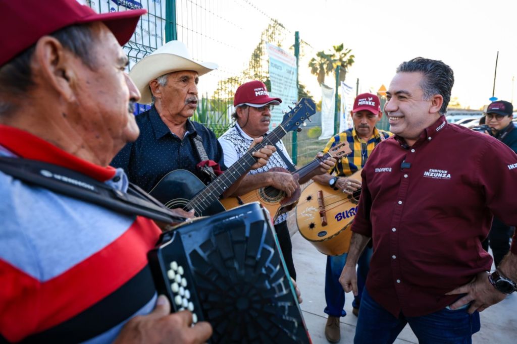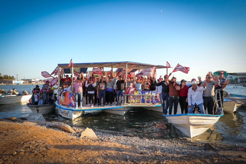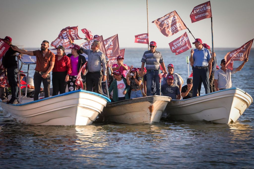 Angostura; 18 de mayo de 2024. Con la canción “Morena, morenita” de fondo, interpretada por los músicos locales; el candidato al Senado de la República Enrique Inzunza Cázarez arribó acompañado del candidato a la alcaldía de Angostura, Miguel Ángel Ángulo «El Profe Mayke», Fernando García candidato a la Diputación Federal por el Distrito 03, y los candidatos a las diputaciones locales Ambrocio Chávez y Eligio López Portillo al encuentro con más de Mil 500 pescadores de La Reforma. El campo pesquero más joven de la República, para refrendar su apoyo al sector que forma parte de la soberanía alimentaria de México.
