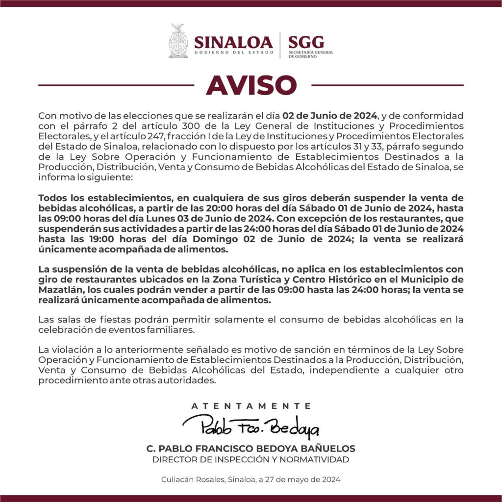 Culiacán, Sinaloa, a 28 de mayo de 2024.- En cumplimiento con lo establecido en las leyes electorales, tanto federal como estatal, con motivo de la realización de la jornada electoral del próximo domingo 2 de junio, se suspenderá la venta de bebidas alcohólicas en todo Sinaloa desde las 20:00 horas del sábado 1 de junio y se reanudará hasta las 09:00 horas del lunes 3 de junio, dio a conocer el director de Inspección y Normatividad de la Secretaría General de Gobierno, Pablo Francisco Bedoya Bañuelos.