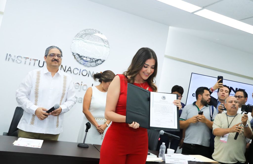 Culiacán, Sin. , domingo 09 de junio de 2024.- Recibe constancia como senadora electa de la República, Paloma Sánchez Ramos, en la sede del INE.