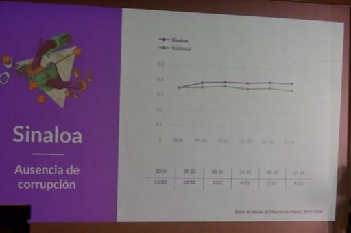 Se subraya que, en esta sexta edición, Sinaloa se ubica en la quinta posición nacional en el IEDMX, una mejora desde su posición 11 en la primera edición de 2018. Destacan sus mejoras en materia de corrupción (factor 2), ya que el estado se ubica en la cuarta posición, desde la posición 15 en la primera edición. También, destaca el segundo lugar en Justicia penal (factor 8), tercer lugar en derechos fundamentales (factor 4) y cuarto lugar en justicia civil (factor 7).