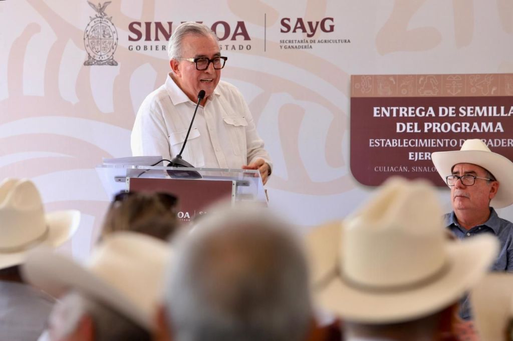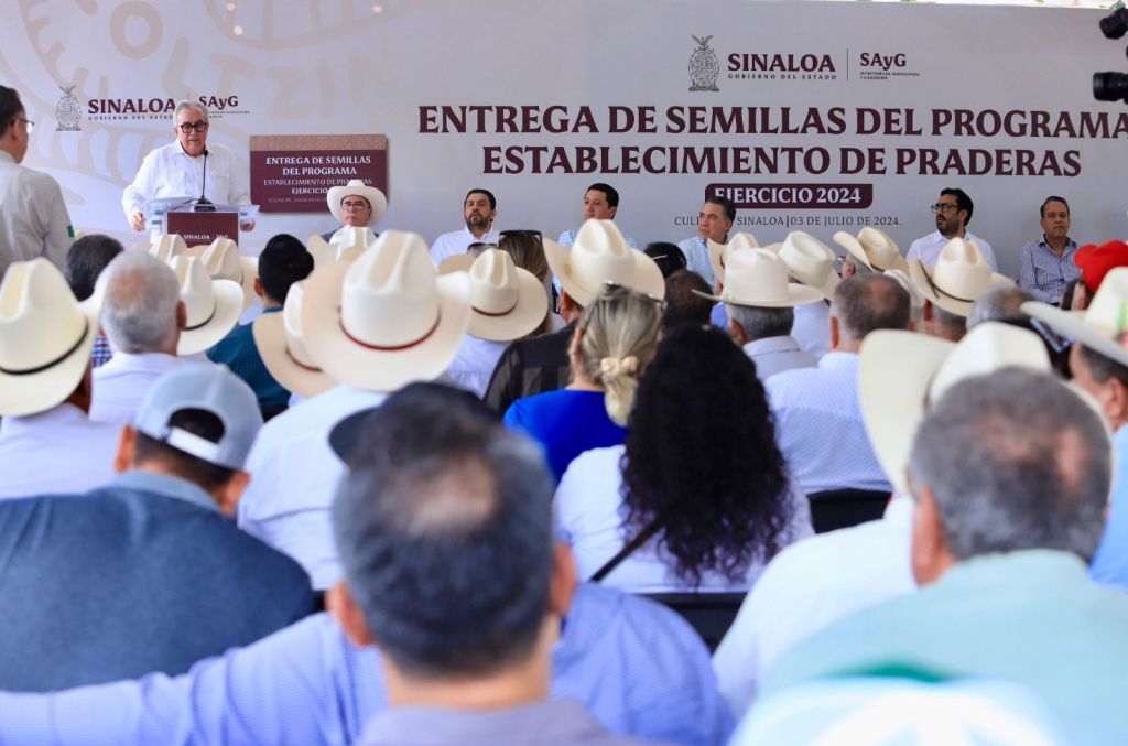 Culiacán, Sinaloa 03 de julio de 2024. El Gobernador Dr. Rubén Rocha Moya encabezó la entrega de semilla para el programa de establecimiento de praderas y garantizar el alimento para el ganado. Durante su intervención el mandatario exhortó a las autoridades y ganaderos a que se realicen los trabajos necesarios para poder rescatar el estatus zoosanitario en Sinaloa, en beneficio de los pequeños y medianos productores engordadores de ganado.