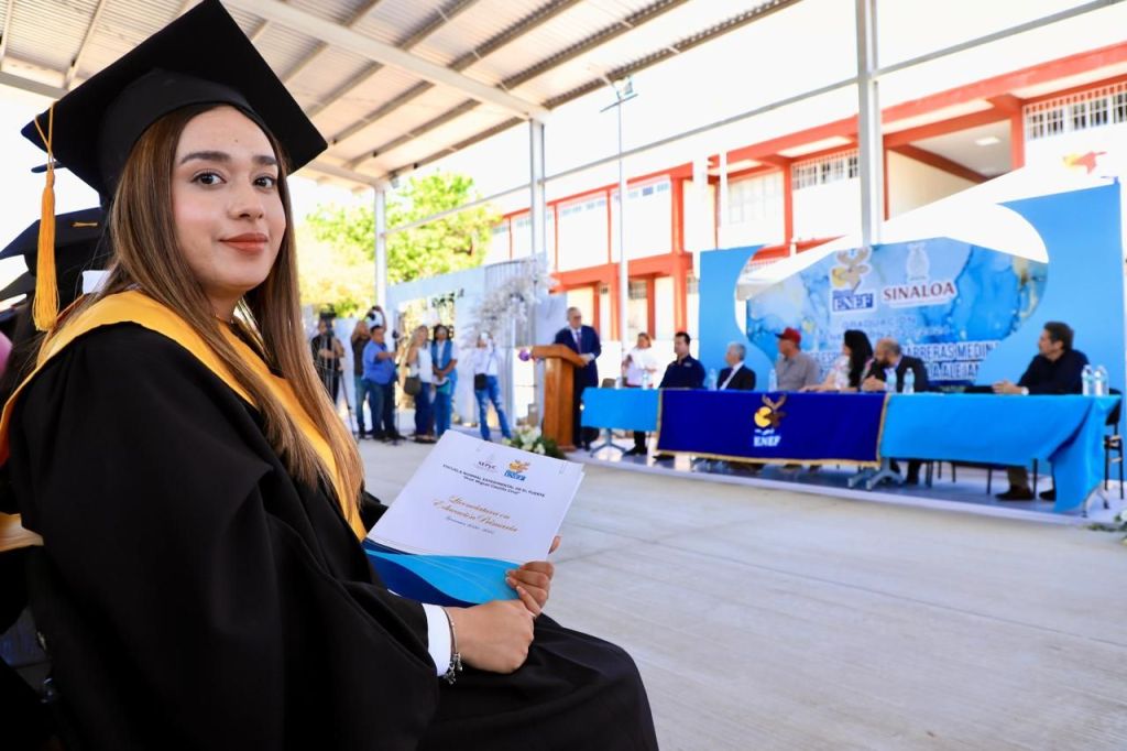 El mandatario estatal fue recibido por el presidente municipal de El Fuerte, Gildardo Leyva; y por la directora de la ENEEF, Cinthia Maribel Vega Quintero, para encabezar la ceremonia donde 189 jóvenes se graduaron como licenciados en Educación Primaria y Educación Preescolar, a quienes se dirigió con un mensaje muy sentido, porque dijo que se ve reflejado en ellos, pues él también egresó de una Escuela Normal en 1969, para empezar con ese apostolado que es la educación, primero en impartiendo clases de primaria en una escuela rural.