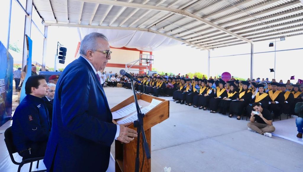 El Fuerte, Sinaloa, a 4 de julio de 2024.- El gobernador Rubén Rocha Moya asistió a la ceremonia de graduación de la generación 2020-2024 de la Escuela Normal Experimental de El Fuerte “Profr. Miguel Castillo Cruz”, donde reiteró su compromiso de continuar apoyando esta institución, que cuenta con un albergue para los estudiantes, donde reciben además del alojamiento, sus alimentos tres veces al día.