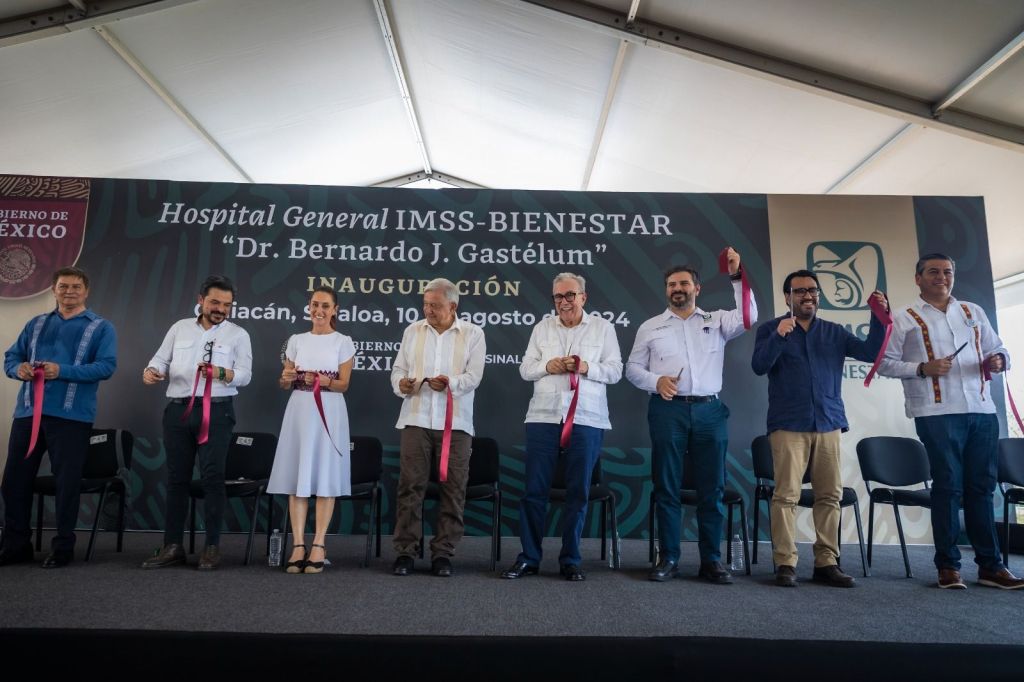 Culiacán, Sinaloa, a 10 de agosto de 2024.- Acompañado por el presidente de la República, Andrés Manuel López Obrador y por la virtual presidenta electa de México, Claudia Sheinbaum Pardo, el gobernador Rubén Rocha Moya inauguró junto con ambos el nuevo Hospital General de Culiacán “Bernardo J. Gastélum”, que operará bajo el nuevo sistema de salud del IMSS Bienestar, con servicios totalmente gratuitos para toda la población no derechohabiente de los sistemas de seguridad social tradicionales como son el IMSS y el ISSSTE.