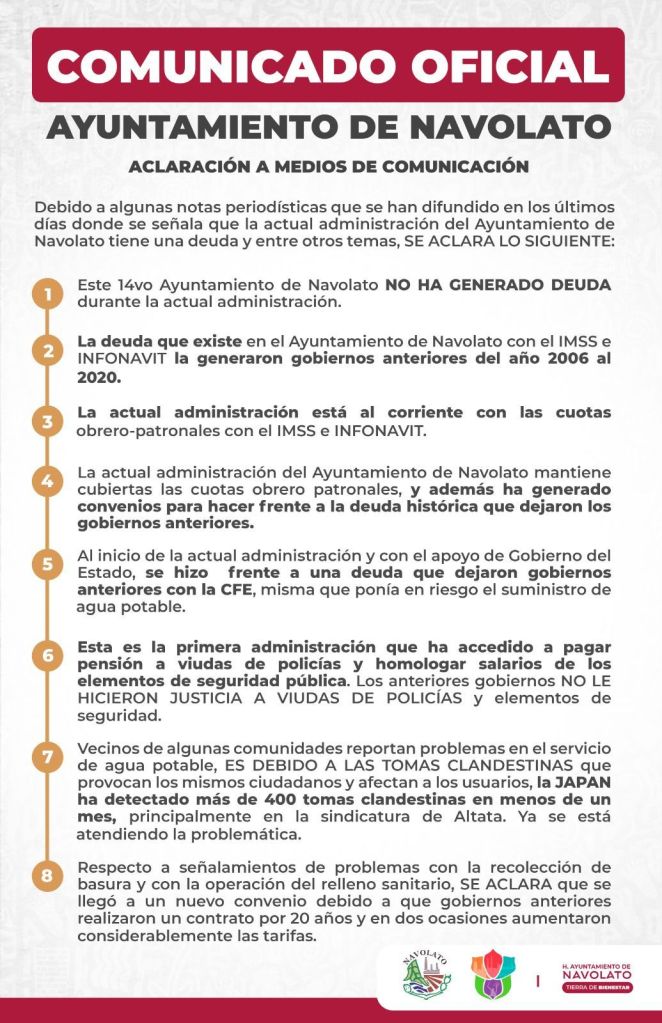 Debido a algunas notas periodísticas que se han difundido en los últimos días donde se señala que la actual administración del Ayuntamiento de Navolato tiene una deuda y entre otros temas, SE ACLARA LO SIGUIENTE: